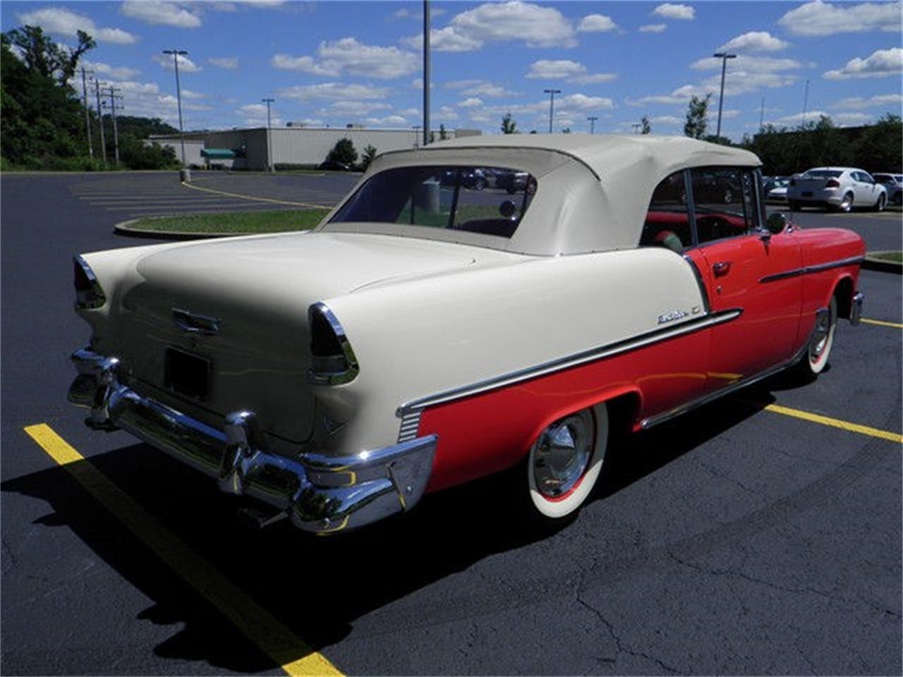 This 1955 Chevrolet Bel Air Convertible is equipped with Super Turbo-Fire V8, a 4 barrel Rochester carburetor and dual exhaust, the "Power Pack" combination produced 180 horsepower to the 2 speed automatic Powerglide transmission. Power windows, push button AM radio, bumper guards and white wide walls. First used in 1955, this Bel Air dash includes two warning lights instead of the actual gauges for oil pressure and generator functions. Excellent condition car.