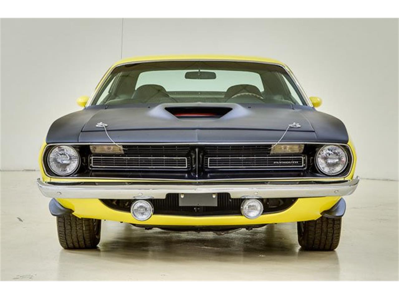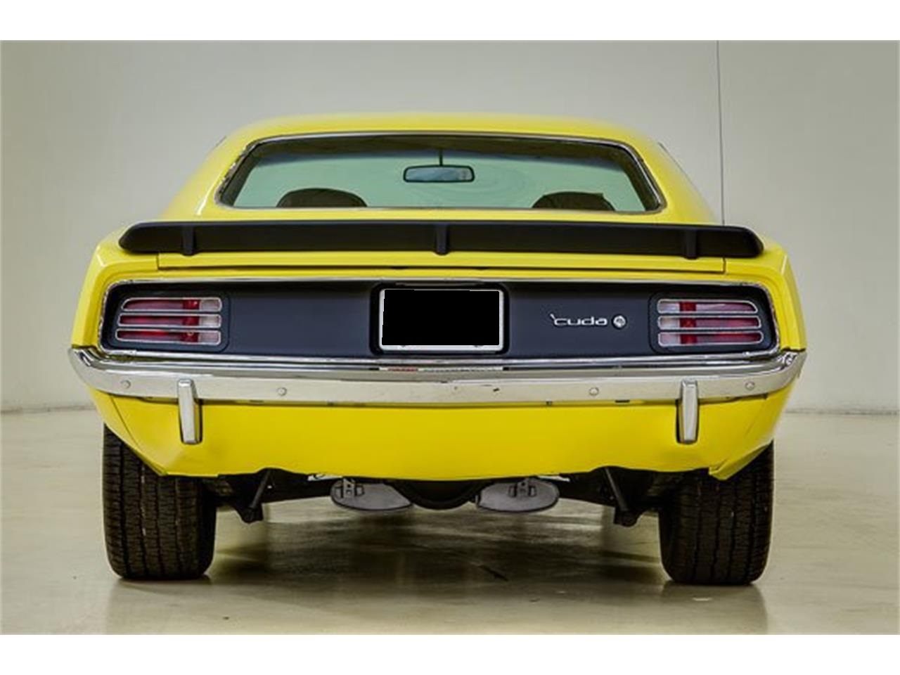 70 Plymouth Cuda. This version of the 340 differed from a production 340 in many ways including a 3x2 Holley carb set-up, thicker main bearings webs and a set of new 360 'J-Heads' with 2.02/1.60 valves. In a way, it was a kind-of a 'small-block hemi' - it could really breathe. This motor was factory rated at 290hp. However, the de-stroked 305ci track version put out 440hp, which leads one to believe that the factory rating may have been a bit conservative. Beyond that, our 'Cuda has a set of full-tube headers with collectors to add just a little more punch. Power is delivered to a 3.55:1 posi-traction differential by a bulletproof Chrysler 727 3-speed Torqueflite. Lemon Twist Yellow exterior and custom black cloth/vinyl interior are in very good condition. The stripes, the spoilers and the matte black hood and this AAR is nothing short of stunning. BF Goodrich Radial T/A tires are mounted on original equipment Mopar Rally wheels. Other upgrades include: power disc/drum brakes, tinted windows, AM radio and Rally-Pak instrumentation.