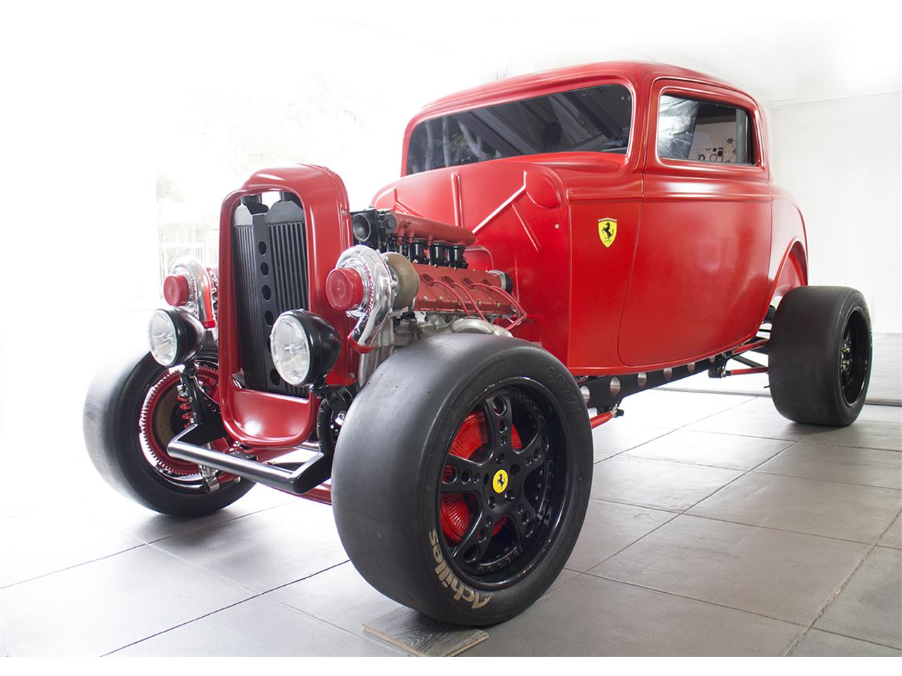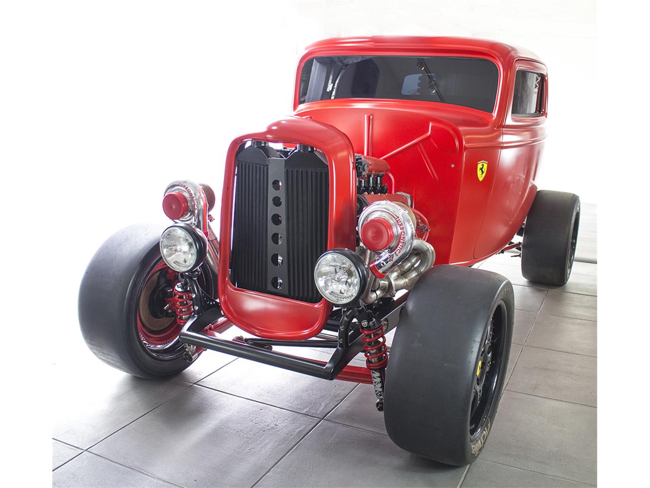 32 Ford chassis, boxed, stainless inserts Independent rear suspension with 15 inches disc brakes and 4 piston calipers Front drop axle with disc brakes hidden behind aluminum drum brakes 18 inches wheels designed by Alan Lee with Achilles Race Tires 32 Ford 3 windows fiberglass body painted with Vintage Flatz satin red power windows pop up doors steel front grill with Mishimoto intercoolers High capacity Aluminum radiator in the trunk AEM infinity engine computer American auto wire harness Dakota Digital gauges Full race roll cage Bucket seat with 5 points harness KW suspension race shocks Engine Specification: 1989 3 liters Ferrari V8 engine 8500 RPM 950 estimated horsepower 9.1 to 1 compression ratio Twin Turbonetics Turbos One off stainless steel Hi Flow headers build by Alan Lee with Cone Engineering pre-bend tubing 6 speed Tremec manual transmission with race clutch.