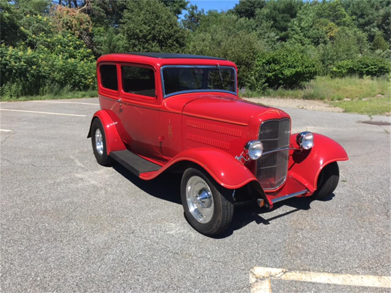 Professionally Built 1932 Ford Sedan Hot rod to the fullest complete custom English Leather Diamond Button Tuft interior Tubed with 9 Ford rear end super wide rear tires Built Chevy 350 with Turbo 350 Automatic transmission all chrome and paint finish shines nice Fire engine red Brown leather with black piping and buttons updated sound system with 6 kick panel speakers and IPod input CD player Real fast and very fun to drive it is a serious head tuner No expense spared when the was built. A perfect addition to any collection.