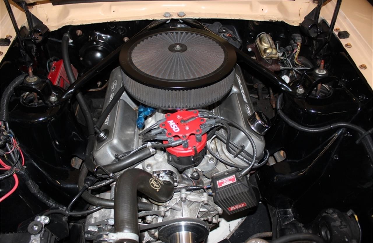 Powered by a 302 engine in the car newly built, 4 speed transmission Top Loader, Quick fuel technology, Edelbrock aluminum intake, Billet water neck, MSD ignition, Pro Master coil, Billet pulleys, chrome oil dip stick, aluminum heads, Powermaster alternator, chrome oil pan, fenderwells and firewall painted High gloss black that is slick and clean. Newer hoses and belt, black anodized K N air filter, aluminum Ford motorsports valve covers.