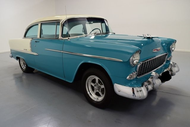 This 1955 Chevrolet is done just the way you want a cool cruising classic to be. The turquoise and white are a period-correct combo that really knows how to attract attention.This car really had style with the form fitting chrome bumper, wide grille, hint of fender overhang in the headlights, and a curvaceous hood with a fighter jet ornament taking off from the center.