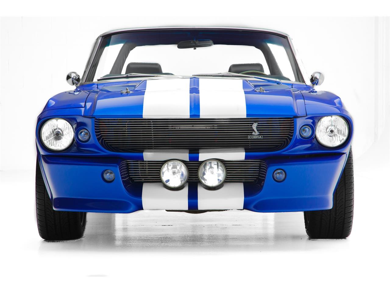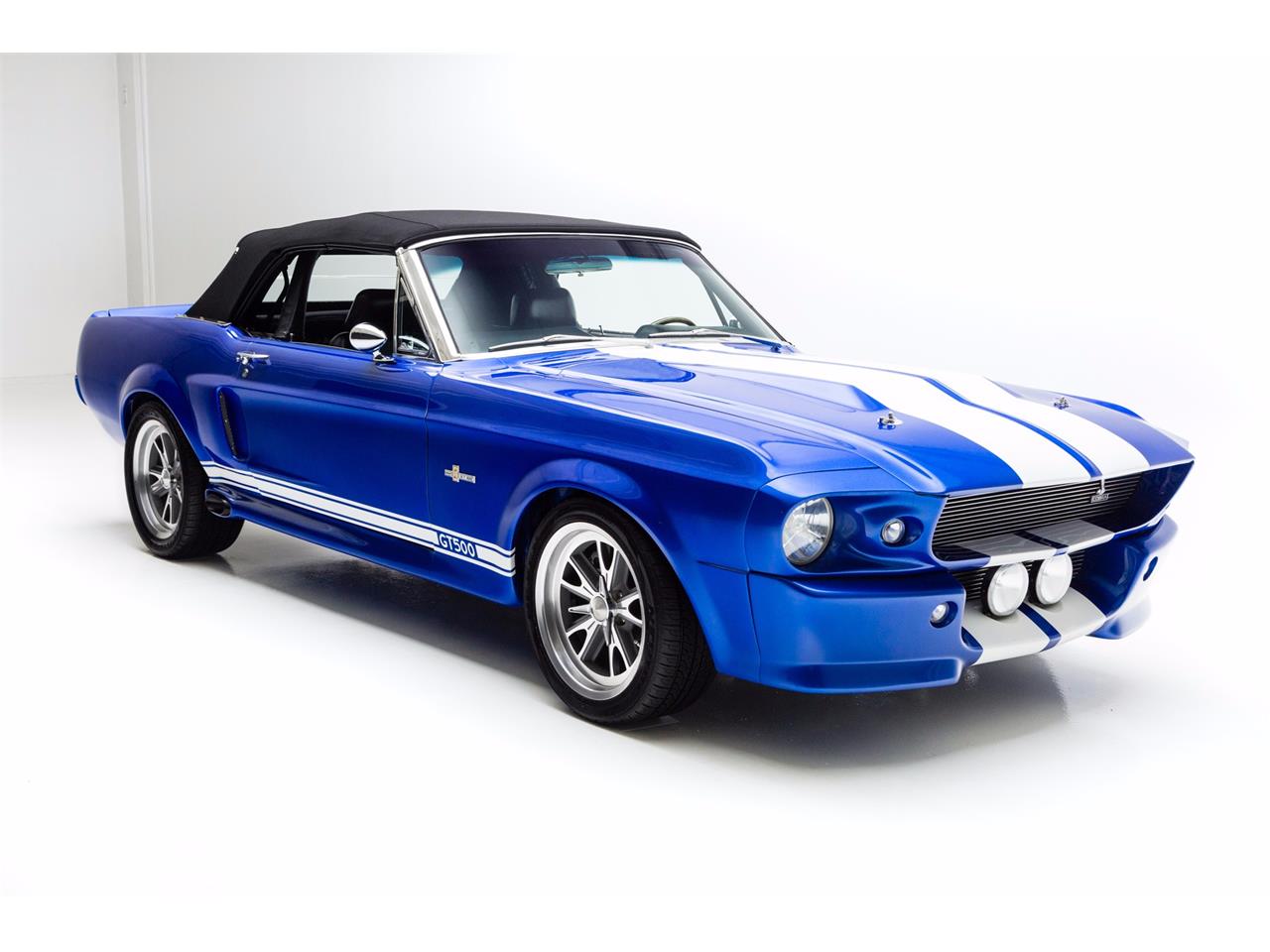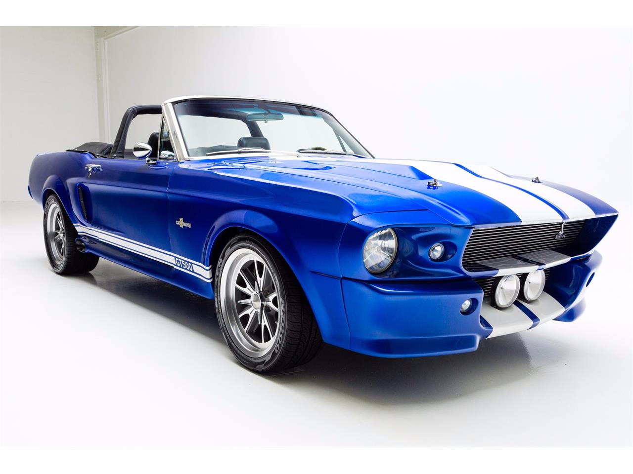 Electric Blue 1967 Mustang Eleanor convertible with white Shelby stripes over the hood. Dyno tested at over 550hp. This is an incredible car to drive. Gorgeous floors painted body color.