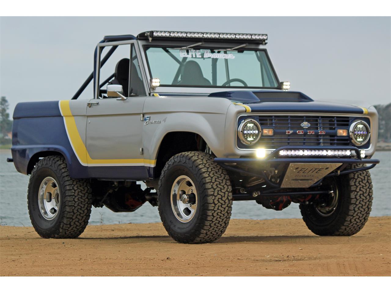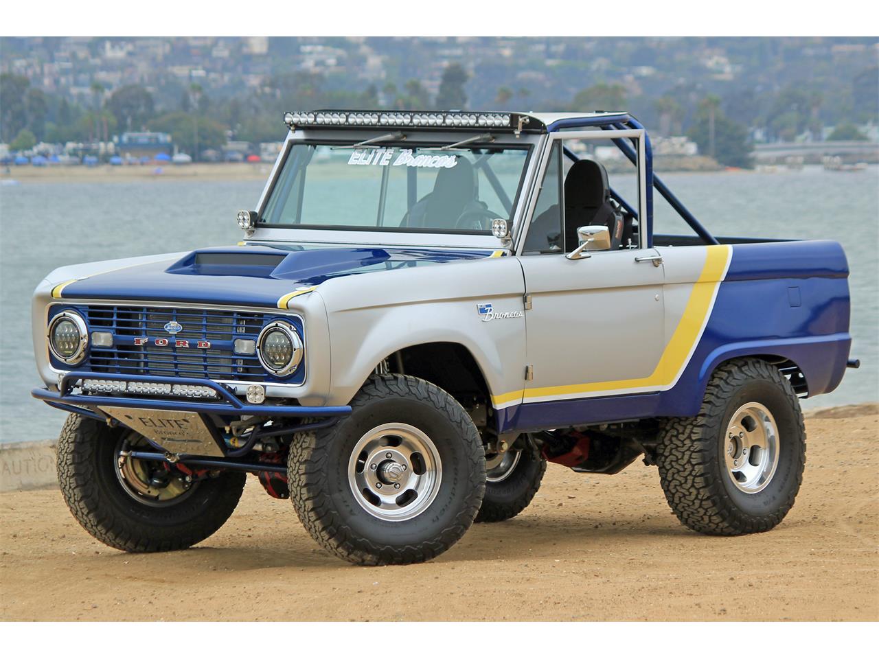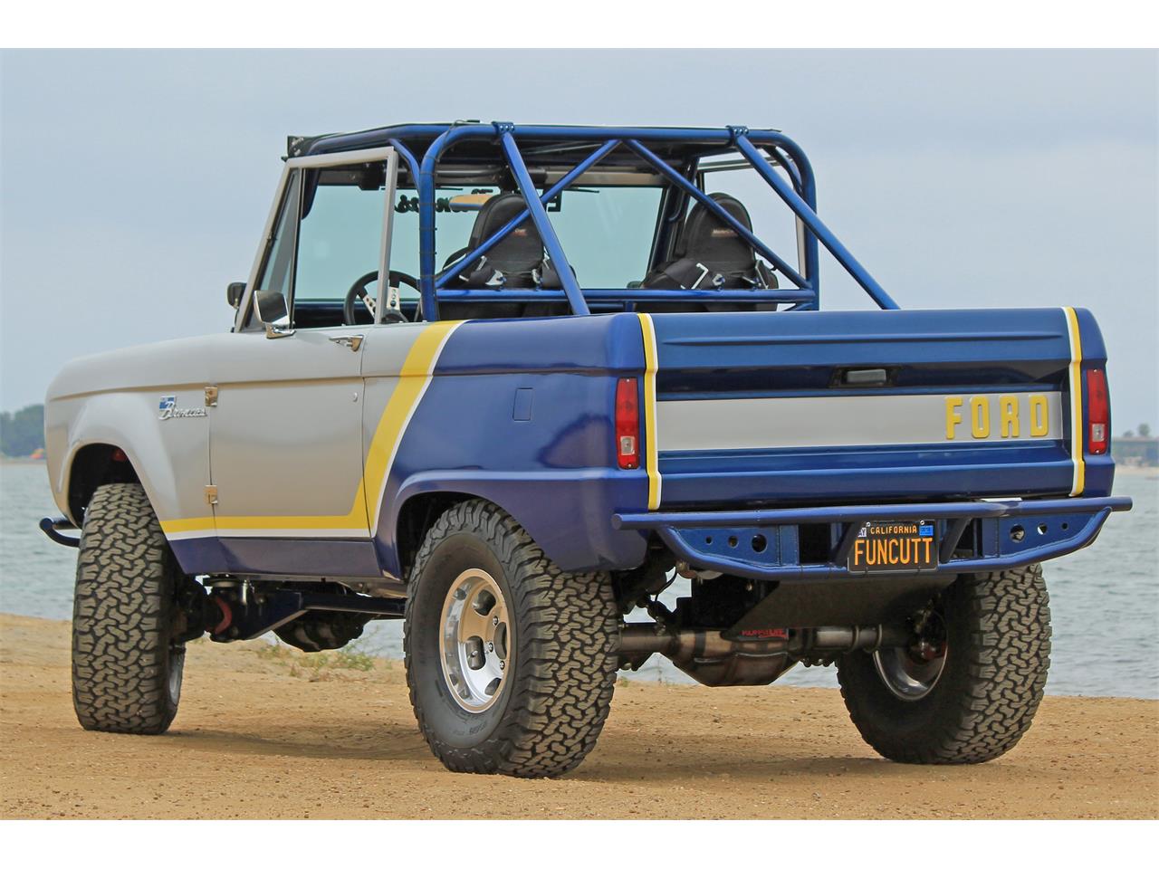 Engine- Fuel injected 5.0 ported Cobra with aluminum heads, long tube headers, serpentine belt, 75mm throttle body and MAF, 24lb fuel injectors for improved fuel injection, MSD ignition, dual Odyssey batteries with built in battery tender. Just plug your Bronco in while parked. Fuel and trans cooler hoses are either steel braided or puch lock, and covered in flame proof sleeving. Drivetrain- a built C4 auto transmission, custom driveshafts with safety hoop, huge big bearing RuffStuff Specialties 9 inches rear end, Dana 44 front, both with Yukon chromoly axles, locking differentials for traction, custom Elite trac bar setup in the rear. Pinion guard, twin stick and gated shifters. Suspension- 2.5 coils, 2.5 inch Deaver springs on Elite shackles, long travel arms in front and Elite hanger brackets, 2.5 inch triple by-pass Bilstein shocks on each corner for complete ride adjustability, adjustable limit straps on each corner. Brakes- 4 wheel disk brakes with adjustable proportioning valve to adjust the brakes the way you like them. Lokar had brake mounted in custom center console. Steering- Power steering with the rare to find Bronco original box that’s been completely built and updated, chromoly steering links with heim joints. Interior- D.O.M. roll cage that’s attached to the frame, Mastercraft seats and harnesses, Kenwood Bluetooth stereo, satellite tweeters, custom powder coated in Candy Blue-silver vein to match cage, center console, lower console, etc. Flush mounted Lowrance GPS, 2 way radio, Dakota Digital gauges, aluminum inner roof, tilt steering column, LeCarra leather wrapped steering wheel, tinted power windows, custom carpet, many layers of heat and sound deadening material on the floor, doors, roof and under the vehicle. Exterior- Fiberglass hood with flush mount billet hood pins, Elite tube bumpers, 50 and 30 inch Baja Designs USA made LED light bars, 4 BD cornering lights, misc. other BD lights throughout under the hood, in bed, and under the Bronco on the frame. Aluminum floor jack. LED headlights. spare tire rack and cooler container are easily removeable for a rear seat. Other Notes- Steel-it stainless coated reinforced frame, 33 inch BFG tires on polished US Mags wheels, 23 gallon fuel tank, on board air compressor for tire inflation, etc, Painless Performance wiring throughout, custom rear sliding window, all brackets and hardware throughout the Bronco have all been powder coated for a cleaner and more durable finish.