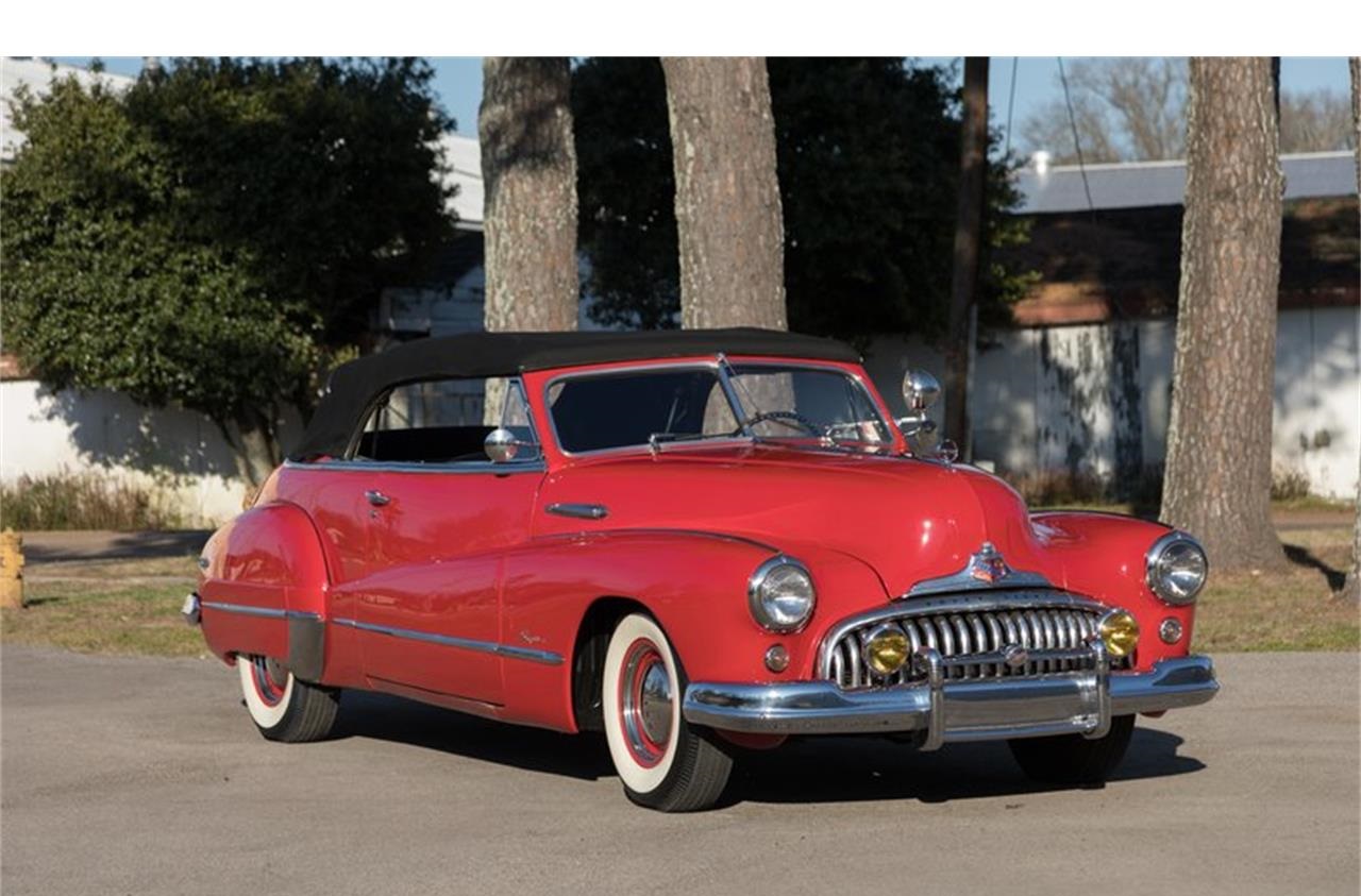 Inside, the black and tan seats welcome your body like a Hilton mattress, compliant, enveloping, with just the right amount of support arriving late. Power windows, power top, beautiful black carpet and red glossy dash, it's posh in here. The car is motivated by a 248 cubic inch Fireball straight eight that hums like a sewing machine. Power is transferred through a three speed manual transmission, column shift. The ride itself continues the theme of round and curvy, with no harshness, jolts, or roughness.