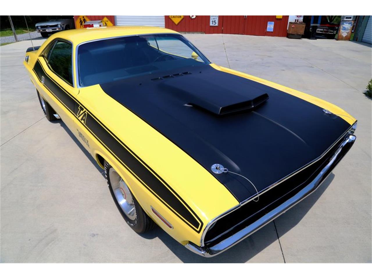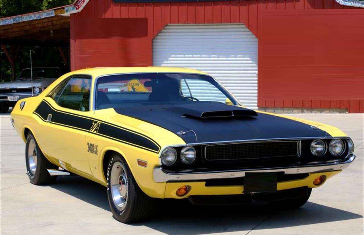 1970 Dodge Challenger T/A. The body on this car is arguably the best of all the E Body Mopars. This car is covered in the factory option of FY1 Banana and is accented by the Black T/A Stripes and Hood. This '70 also has the correct Black Spoilers and the fast access Quick-Fill fuel door. All the Chrome and Stainless on this car is in like new condition. To finish off the exterior it's sitting on a set of 15" Steel Wheels with the Dog Dish Hub Caps and the GoodYear PolyGlass GT Tires. On the inside it's also done in the factory Black option which provides the perfect complement to the exterior color combo. The console features the Wood Grain accents that ties in perfectly with the steering wheel and dash. Speaking of the dash you can see it has the Rallye Gauges with the Tach and they are working! Also, the dash pad itself is in phenomenal condition. Looking in the trunk you'll notice it's all rock solid and has the Spare, Jack, and Air Bottle. Under the hood it sports that Matching Numbers 340 Six Pack engine that's mated to the Numbers Matching 727 Trans and the correct 8 �" Sure Grip rear end with 3.55 Gears. The six-pack set up is dressed in the correct breather that seals to the fresh air hood. This T/A comes with Power Steering along with Power Brakes with Disc up front and drums on the rear. For exhaust it has the correct manifolds (2863549 and 2863553) with the dual pipes and correct style mufflers with the side exiting exhaust.