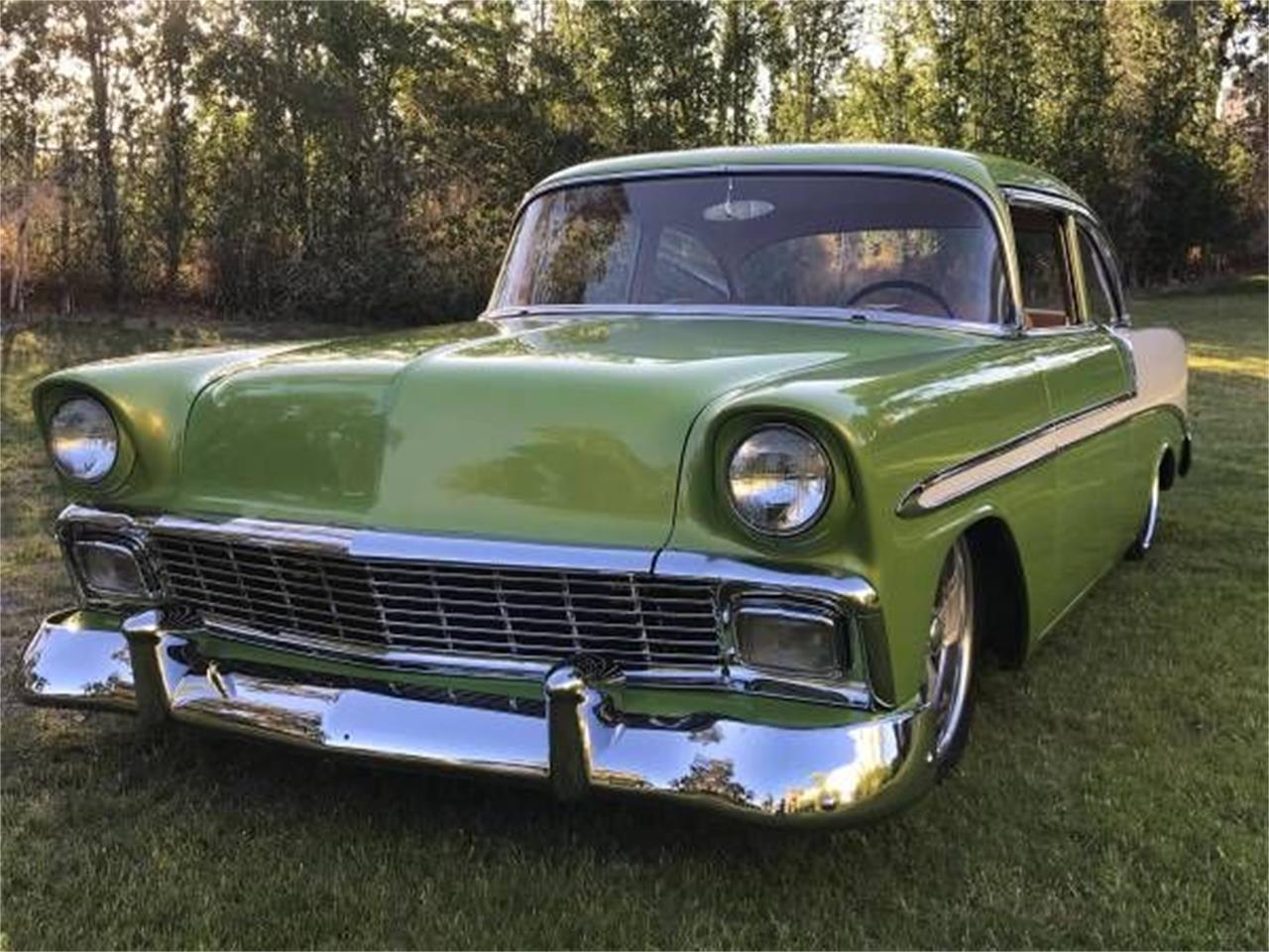 1956 Chevrolet Bel Air received a face lift with a more conventional full width grille, pleasing those customers who didn t favor the Ferrari inspired 55 front end. Distinctive two tone bodyside treatments and graceful front and rear wheel openings completed the speedline restyling. Single housings incorporated the taillight, stoplight, and backup light, and the left one held the gas filler an idea popularized on Cadillacs.