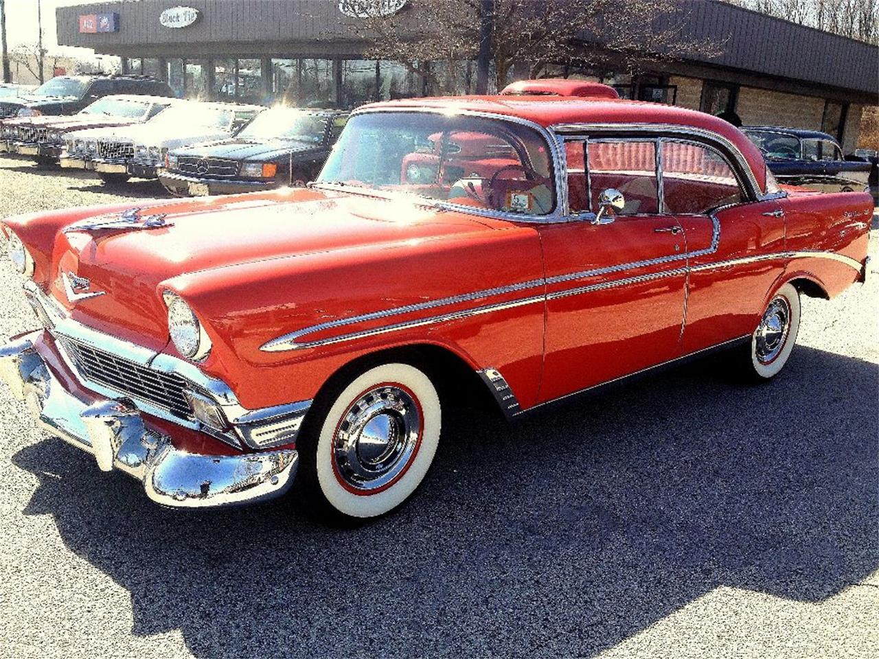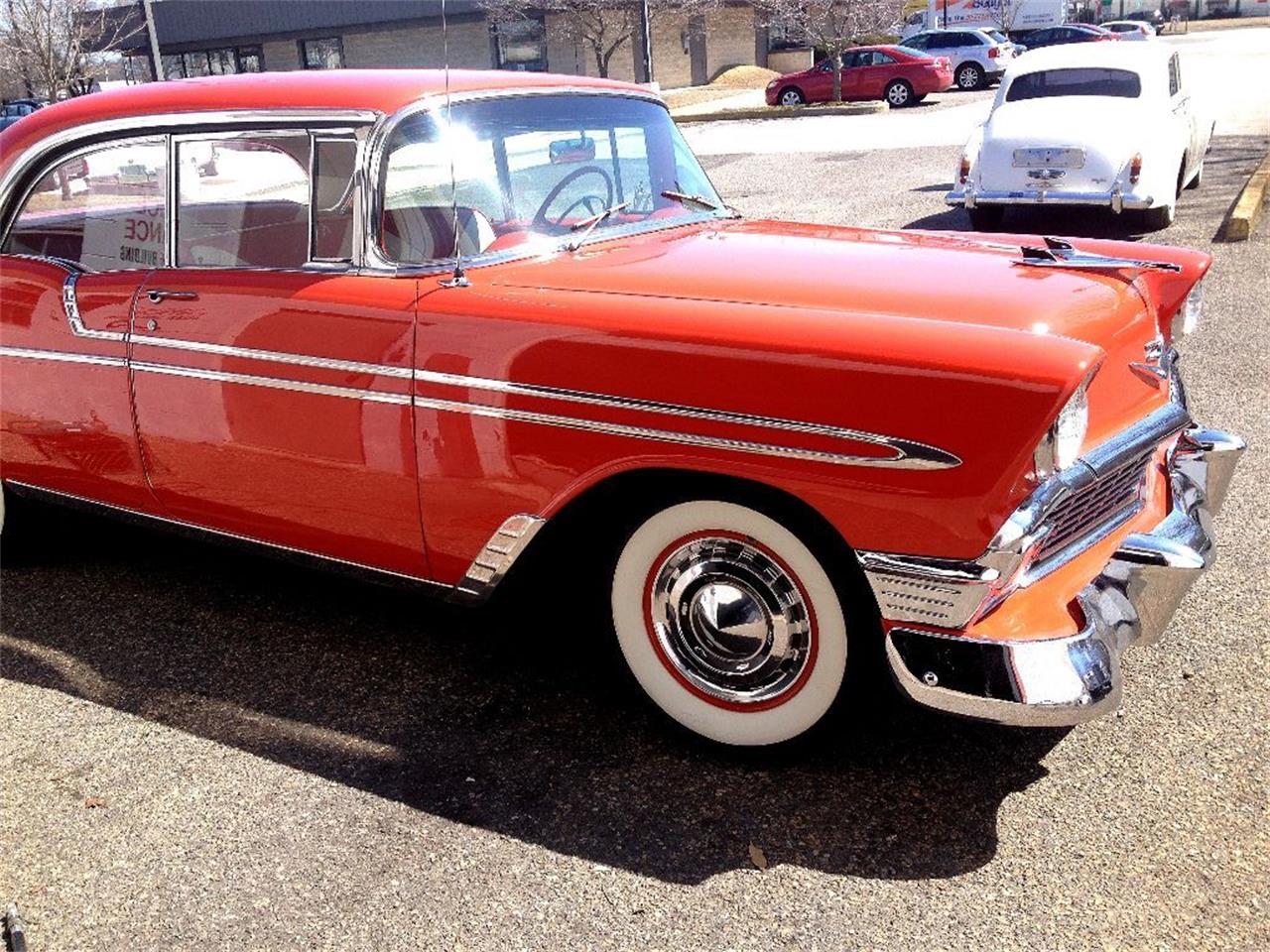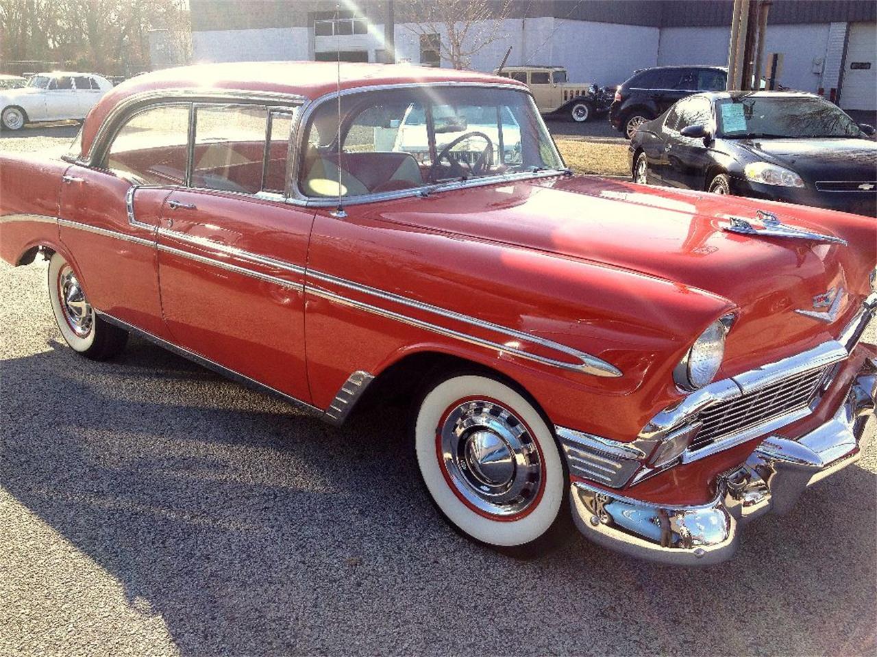 Now Look at this rear one 1956 Chevy Belair 4 Door Hardtop,The Engine is and original 265 220 Power Pack,The tires are original style Wide Whites that set it off just right with that beautiful solid red paint looks just great