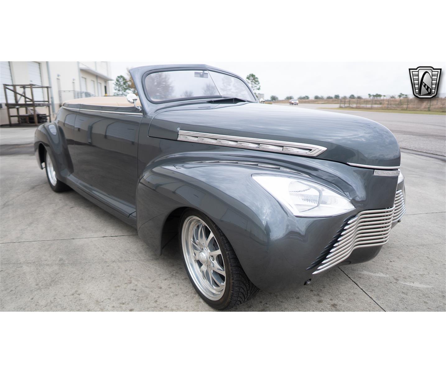1941 Chevrolet 2 door convertible. This car started off as a Super Deluxe convertible model then made into a roadster by eliminating the side windows. Original steel with all seams welded shut and smoothed. GM paint, Cyber gray. Some notable features on this car would include the Dolphin gauges, adjustable air ride suspension, fiberglass Carson top that is wrapped in tan cloth, Centerline offset 17" wheels, Disc brake kit on the front, OEM Chevrolet power steering, power brakes. Powering this car is a 350 CID V8 engine that is mated to a TH350 automatic transmission and putting the power to the ground is a GM 10 bolt rear end. This custom roadster is turnkey and ready to hit the road!