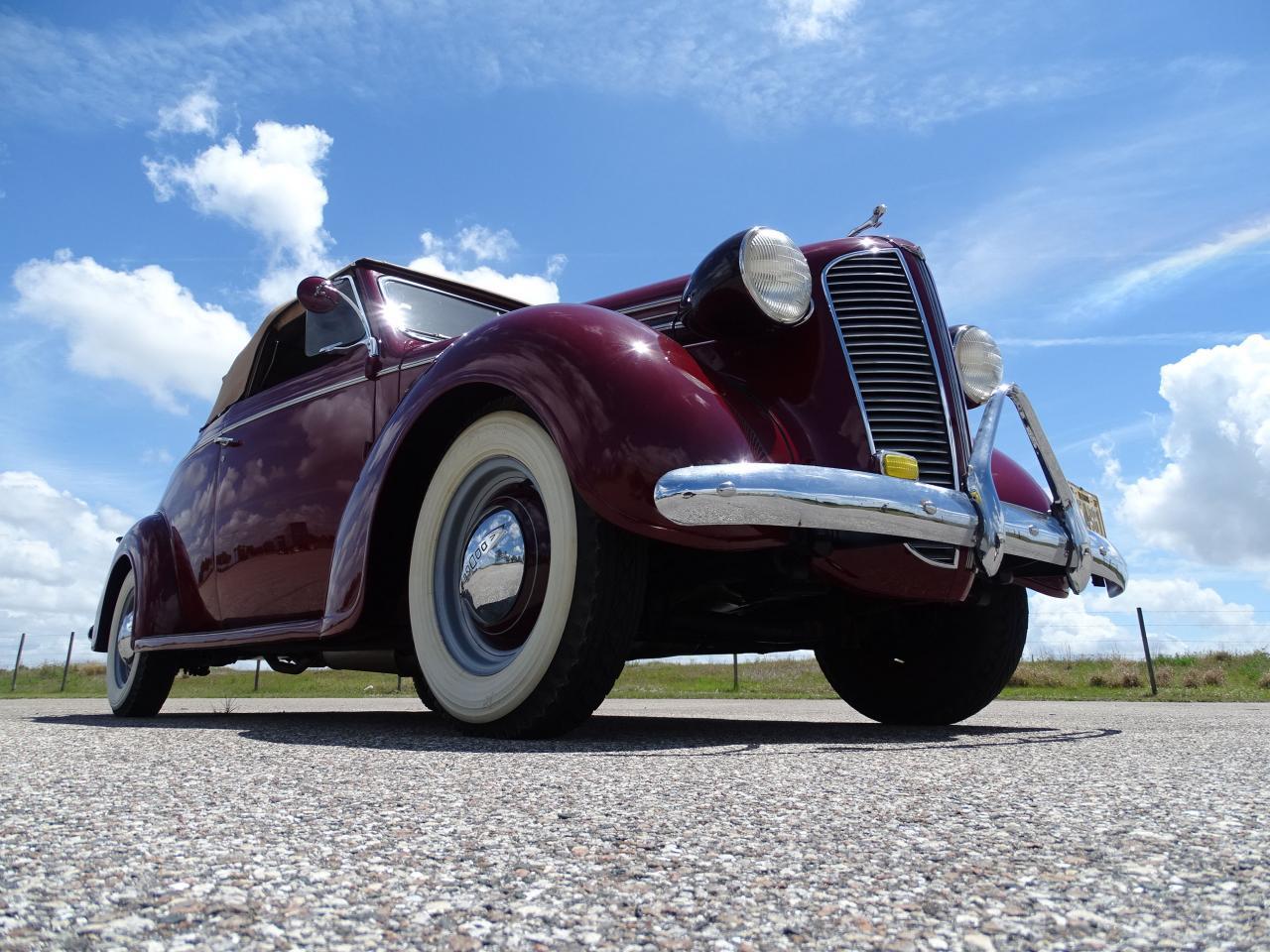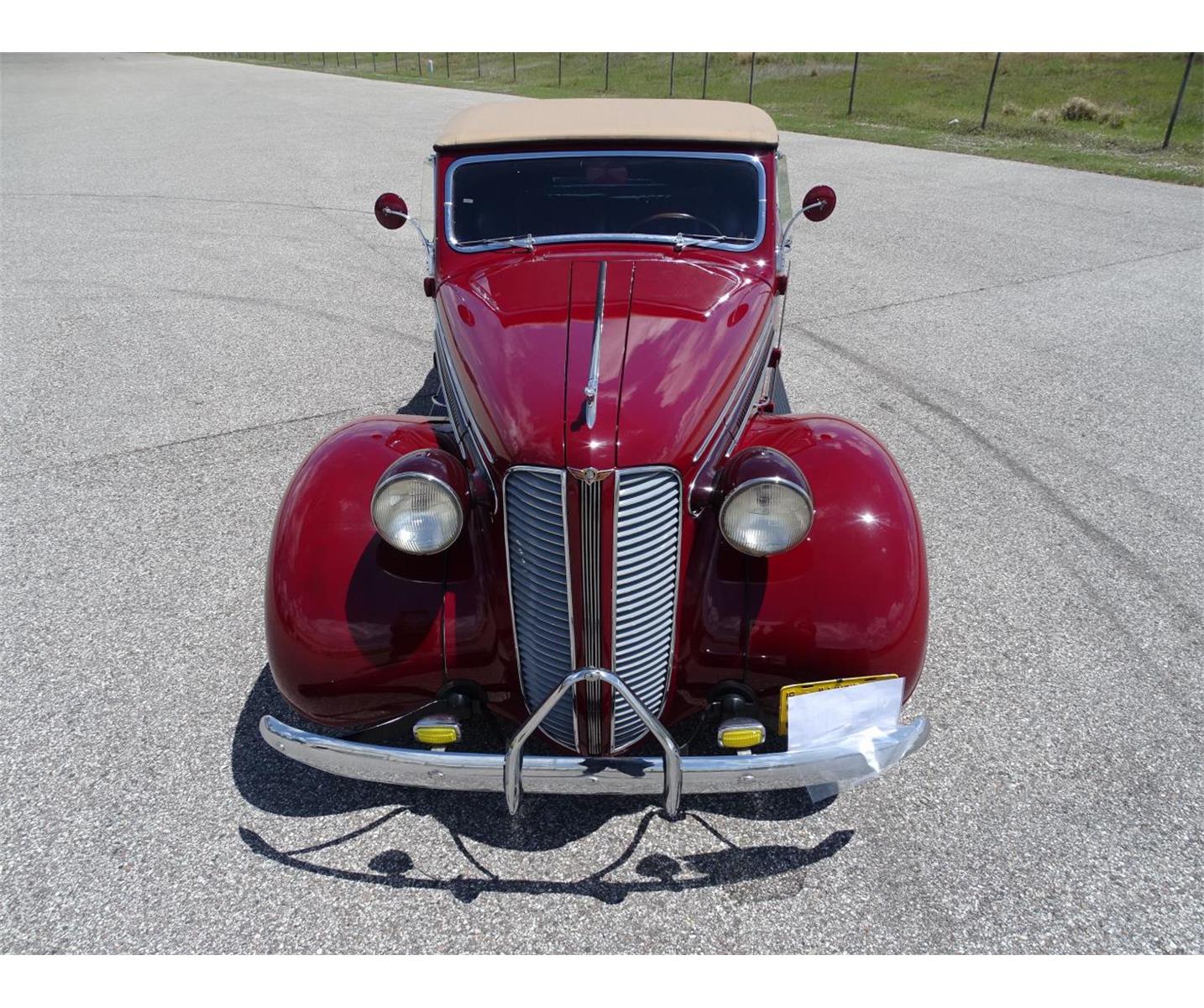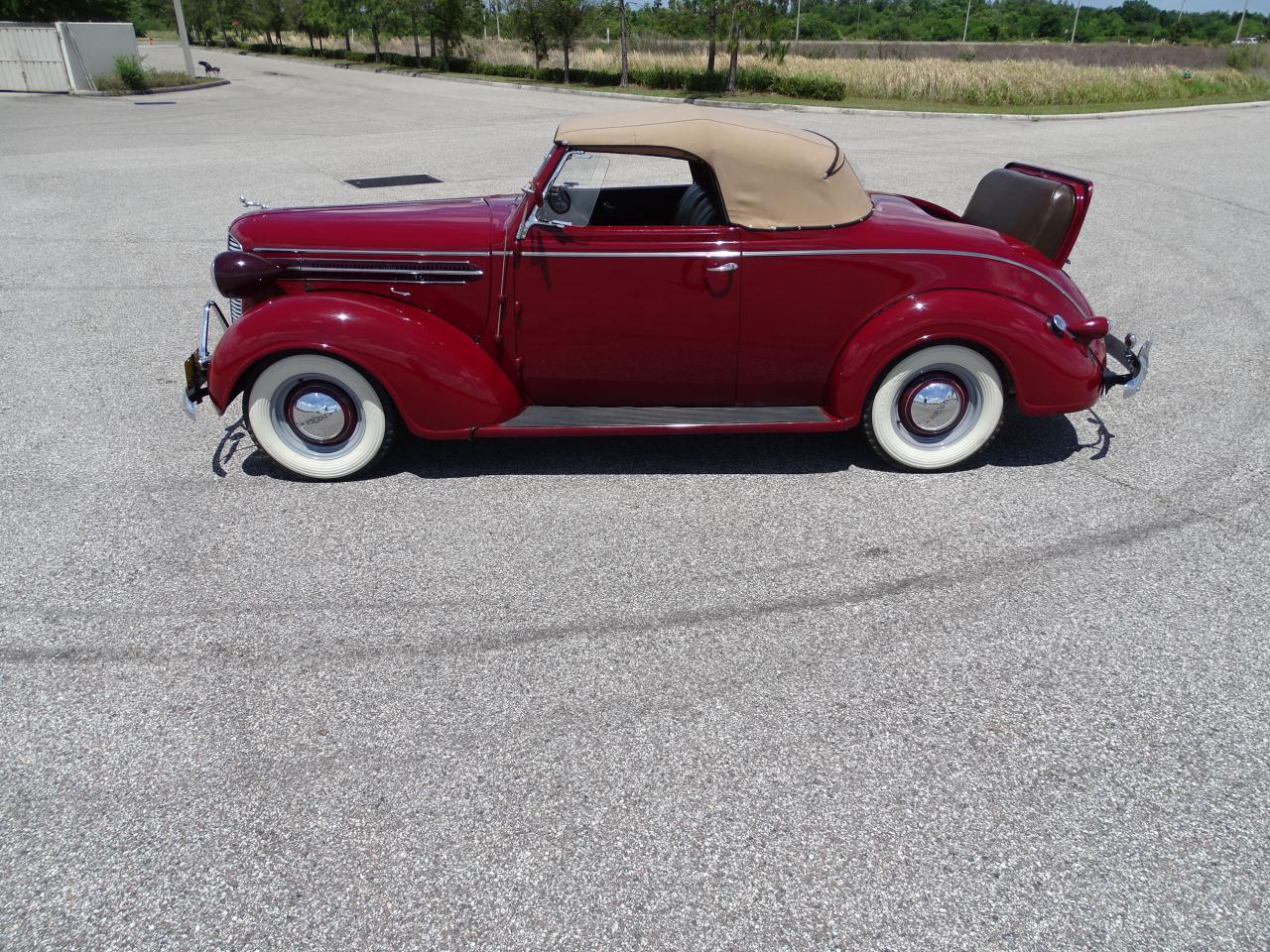Rare 1937 Dodge D5, technically known as a Convertible Coupe, with fixed windshield, roll up windows in the doors and a rumble seat instead of a trunk. With the 115-inch chassis, 3,057 pounds, long hood, ample cockpit and subtly curving rear body line the proportions are sleek, long and low. The body is straight with great panel gaps and expertly applied Cherry Red paint. The interior is one of the strongest points of the car done in a stunning tan leather on the seats and door panels. This straight 6 cylinder and manual transmission have only 85k actual miles with only 2 owners since new. Modern vintage look gauges, leather interior, chrome wheel rings, tail lamps, white walls, AM radio.