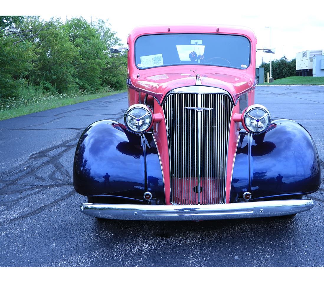 Powering this '37 is a rebuilt 350 small block V8 engine and mated to a turbo 400 automatic transmission. When looking under the hood or through the open side panels, you will instantly notice the chrome Edelbrock valve covers, long tube headers, modern 134a AC compressor, Weber Carburetor, and even Chevrolet "Heartbeat of America" covers.