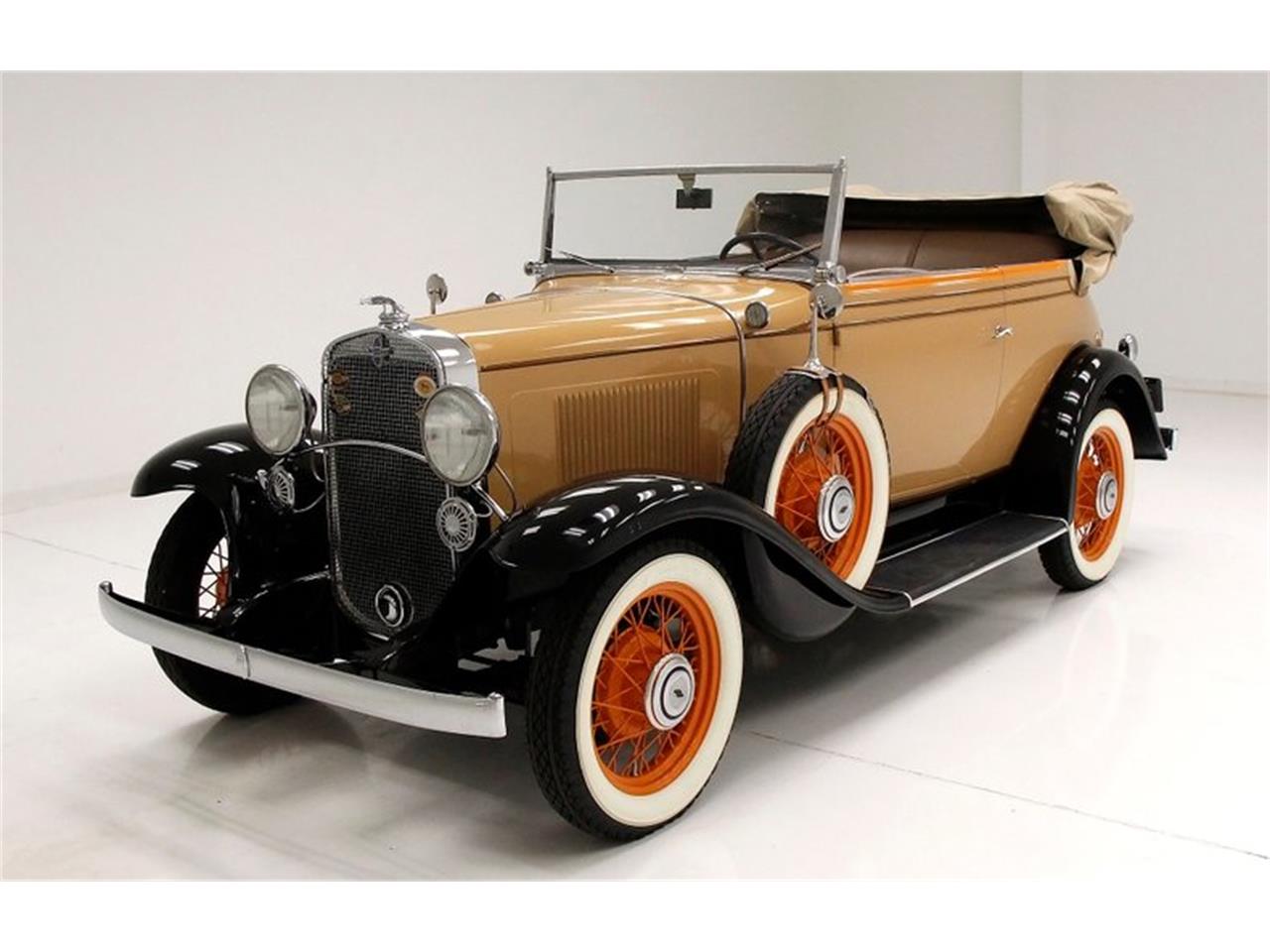 Coffee Cream paint in absolutely perfect condition is seen on perfectly straight, nicely gapped panels on every corner of this car. Black fenders and running boards frame wide whites with spoked wheels in a beautiful Swamp Holly Orange, which makes for just an incredible visual color combination. With a consigner stated 36K original miles, this car is loaded with rare options which include a deluxe body, deluxe bumpers, twin horns, twin cowl lights, an unheard of twin windshield wiper, twin side mounts, and twin taillights. Also, noteworthy a rear luggage rack, leather trunk, front stone guard, and a custom car cover. All of this stopped with a fawn colored canvas top in pristine condition. Full leather for the front buckets and rear bench which are flawless and have padding like the day they were upholstered. Leather door panels matching the seating have a pocket and very nicely chromed window cranks, pulls and openers. A shout out to the door sills and windowsills which are lacquered walnut. A rare GM style hot water heater is added, as well as ashtrays for the rear occupants.