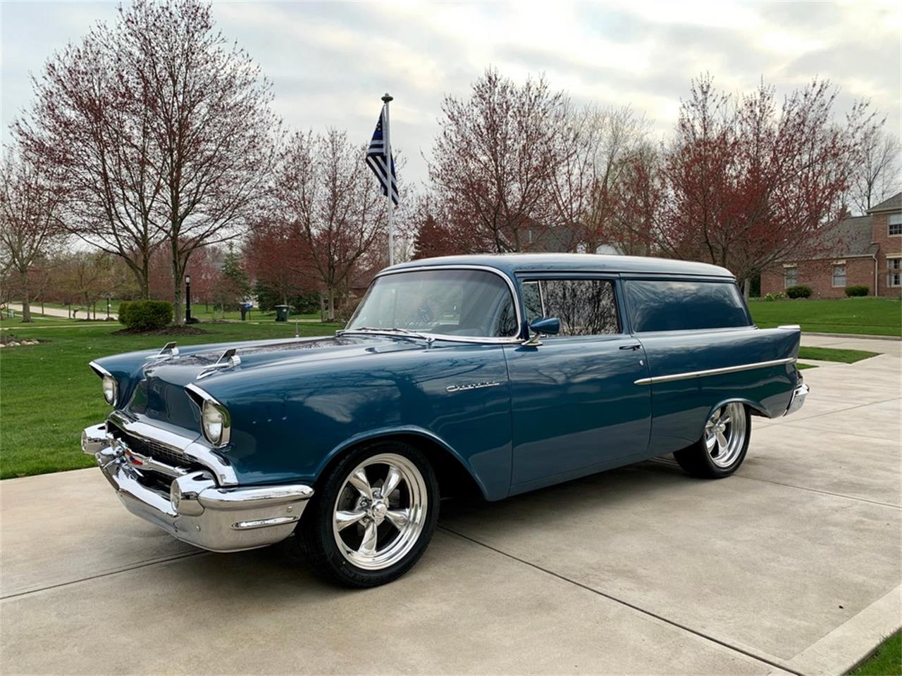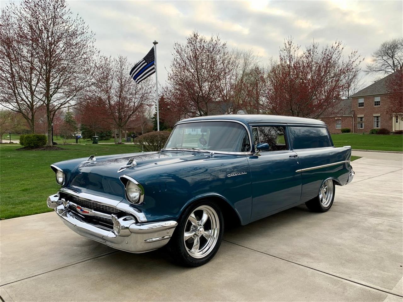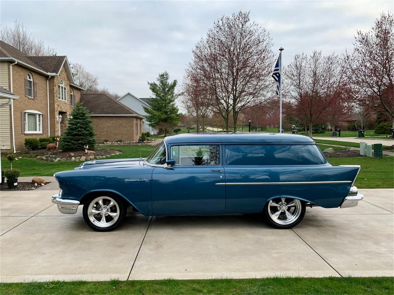 1957 Chevy Sedan Delivery. Powered by a rebuilt period correct 1958 283 ci motor bored . Aluminum water pump, and dressed very nice with corvette style aluminum finned valve covers, chrome alternator, and chrome air cleaner. She runs strong and smooth. The engine sits in a nicely detailed engine bay.