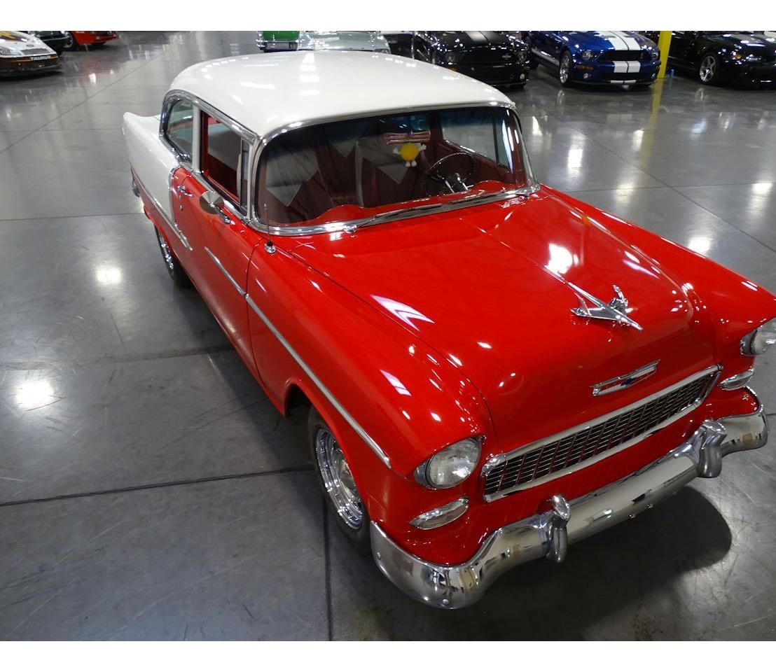 The V8 is paired to a Super T10 4-speed manual transmission that was designed for high-powered muscle and sports cars and this one features a Hurst shifter too. Check out the Red and White leather interior that just screams vintage "Americana" on this high quality Tri-Five- the bucket seats are supportive and comfortable to sit in and the custom center console flows with the design flawlessly. Auto Meter gauges, Air Conditioning and an AM/FM Radio are some of the highlights of the options in this well-built Chevrolet.