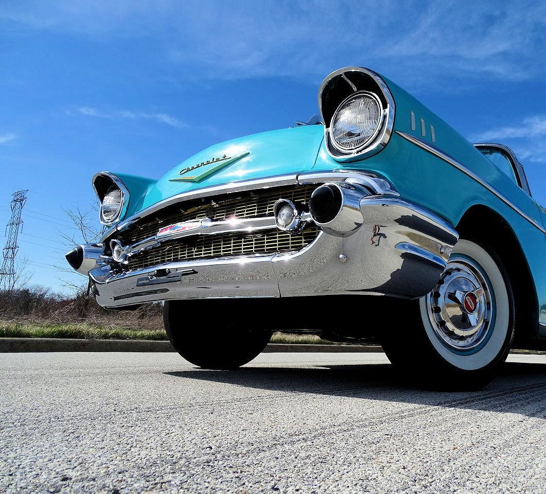 The car is powered by a small block 283 CID V8 with 4 Barrel power pack Carburetor with 220 HP featuring an old school 3 on the tree manual transmission and power steering. This Bel Air comes with hub caps with white wall radial tires. The paint and chrome are in great shape.