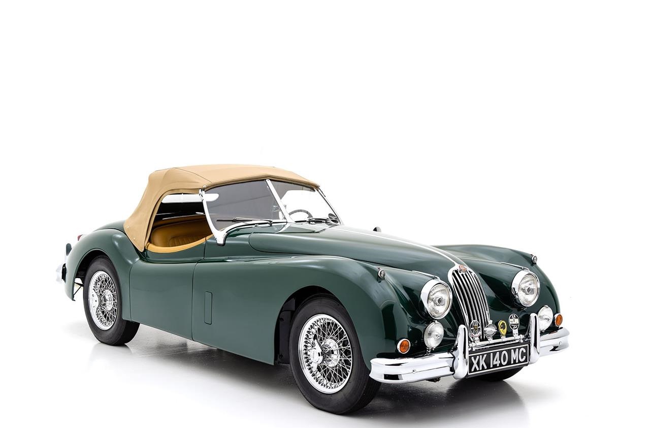 Jaguar XK140. The 190 horsepower version of the 3.4-liter inline-six from the XK120 M now served as the standard engine, with the optional C-Type cylinder head boosting output to 210 horsepower. Straight-line performance was about the same as the XK120, but road-holding vastly improved thanks to the addition of more precise rack and pinion steering, telescopic dampers, larger brakes, and better suspension travel. The beautiful looks remain virtually the same, except for some subtle refinements to the bumpers, a slightly wider grille, and additional body trim. These improvements made the XK140 more comfortable, predictable, and enjoyable to drive regularly, while still offering the thrilling performance that made the XK120 such a legend.