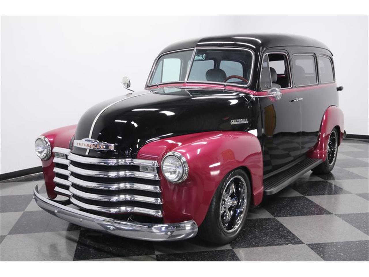 This 1951 Chevrolet 3100 1/2 Ton Suburban Carryall has been upgraded with a two-tone look, V8 power, overdrive transmission, and an all bucket seat interior.
