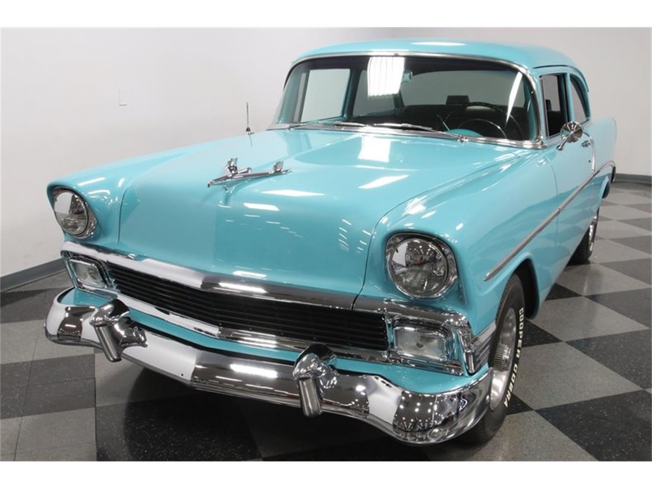 1956 Chevrolet 210 for sale. Turquoise is a great color to have on a classic '56 Chevy. It has all the classic pieces you love, like the full-length sweeping side trim, jet-inspired hood ornament, and mirror-like wraparound chrome bumpers. Inside is more of the same story. There are great classic elements, like the dual cowl dash and two wide rows of bench seating. The seats are finished in a comfy cloth. Plus, the door panels, headliner, and carpeting have all been re-done to match and are looking nice. Under the hood is proper small block Chevy power with a 307 cubic-inch V8. This continues the theme of well-placed upgrades as the tidy orange block has been given added power with an Edelbrock four-barrel carburetor and Edelbrock intake. The dual exhaust makes a terrific tune you'll love to hear on the open road, and this one really is made for driving. That's why you have nice features like power steering, a three-speed automatic transmission and an upgraded aluminum radiator. Plus, the four-wheel power disc brake upgrade gives you better confidence than you get in many other classics of this era.