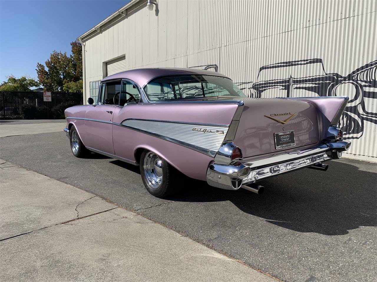 Absolutely Pristine 1957 Chevrolet Bel Air Hardtop 2 Door Coupe with Champagne Lavender exterior paint and a sensational two-tone black and silver interior. 383 cid V-8 crate motor under the hood with a Hughes TH400 automatic transmission with a torque converter, a Flowmaster exhaust, a Hurst shifter, power steering, power front disc brakes, chrome and baby moon 15" wheels with BF Goodrich tires, Vintage Air, an awesome sound system.