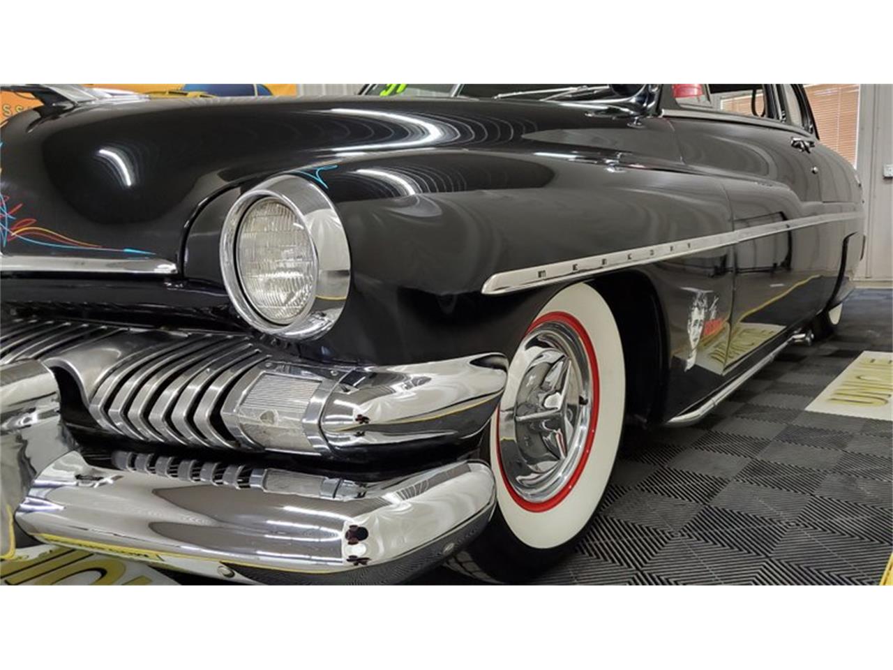 1951 Mercury Eight Coupe finished in gloss black with pinstriping highlights.