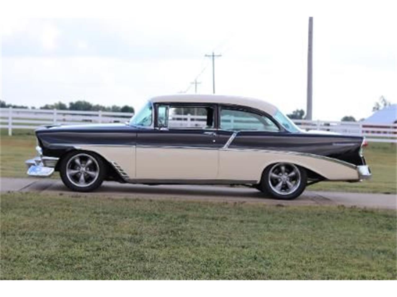 This 1956 Chevrolet 210 2 door sedan with 28,421 miles. The interior is Black and White and the exterior is Onyx Black over India Ivory. 350 with Edelbrock intake & carburetor, HEI distributer, 350 Turbo automatic Transmission, 10-bolt rear with 3.08 gear, headers with dual exhaust, chrome steering column with tilt, GM comfort grip wheel, rocker panel trim with front fender rock guards, aluminum radiator, 605 power steering box, 4 wheel disc brakes, electric wipers, am/fm cassette player, air conditioning, heat, 17' Allow wheels, new tires, front and rear bumper guards.