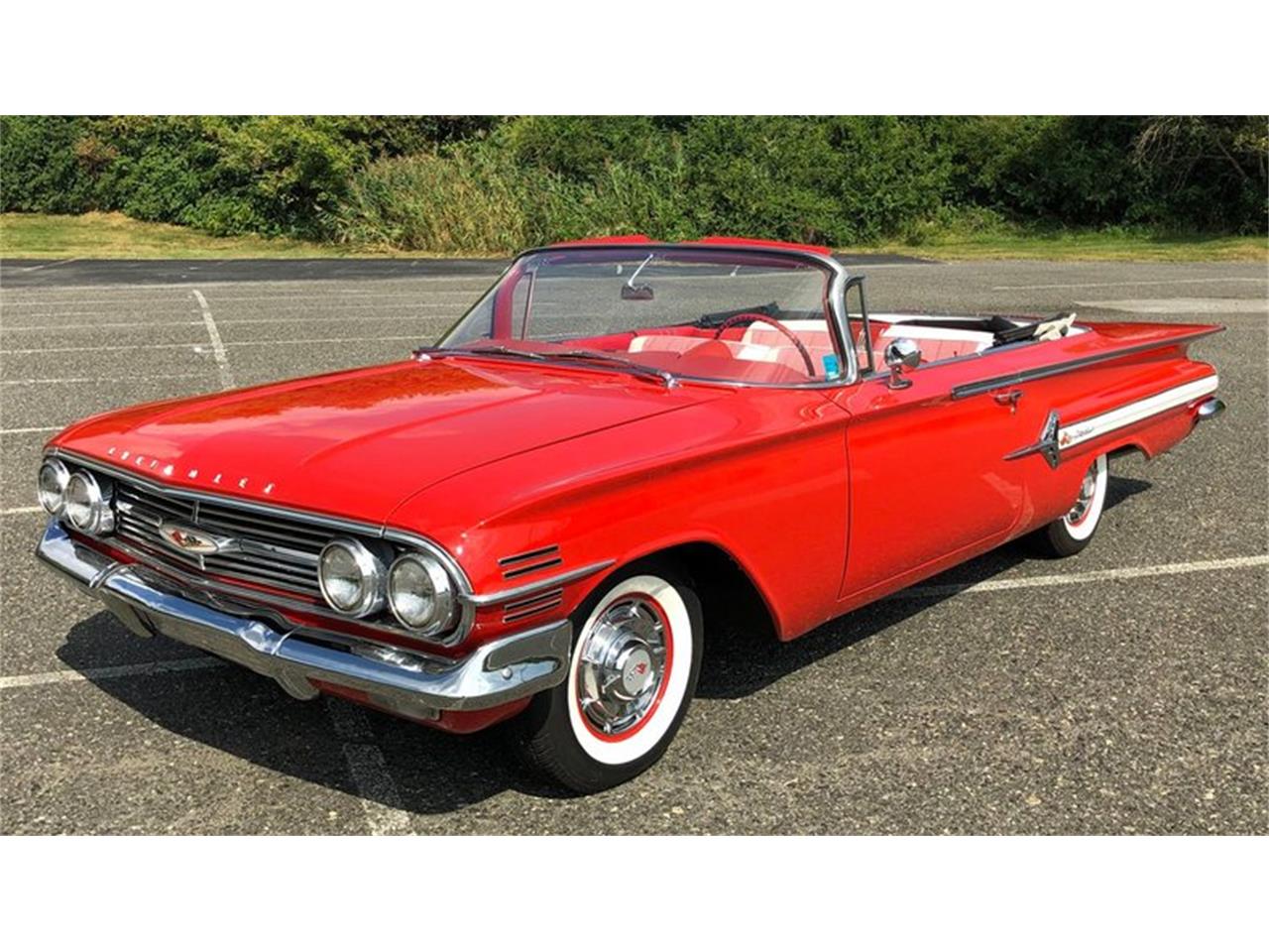 1960 Chevrolet Impala Convertible, 43,000 miles, beautiful frame-off restoration, totally rust free, stunning Roman Red paint, immaculate Red and White hounds-tooth interior, excellent White top, gleaming chrome and trim, 283 cu in 230 HP Power Pack V8 engine, 3-speed manual transmission, power steering, power top, radio, wheel covers with spinners, padded dash, new wide white wall radial tires, runs and drives great!