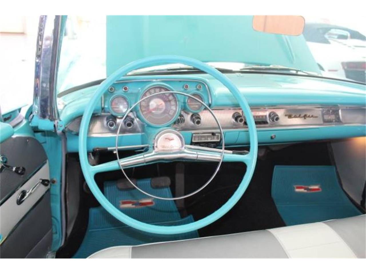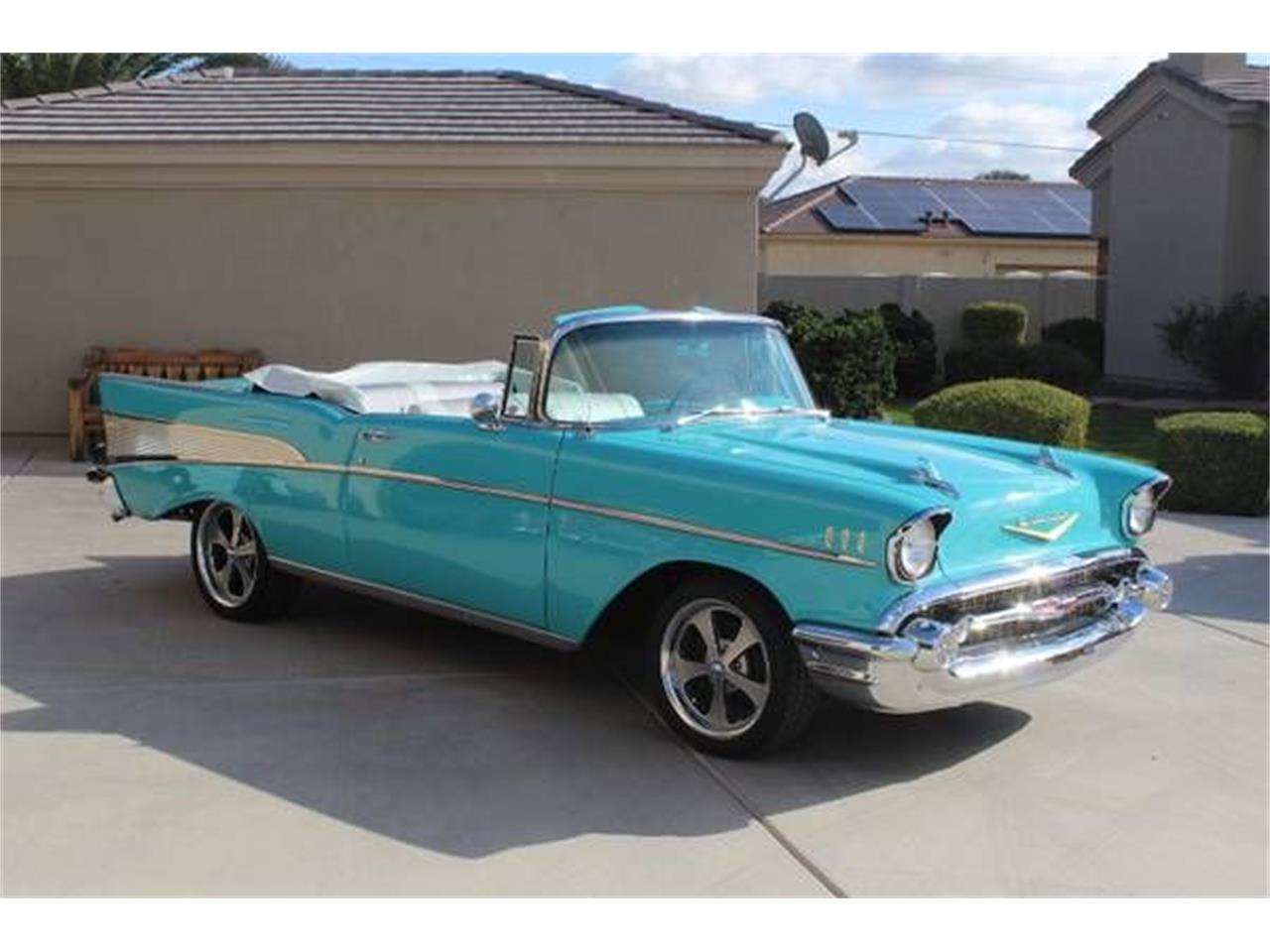 1957 Chevy Bel Air convertible. This is a rare car with a 3 speed manual transmission, turquoise paint, and power top. This is an original car, it comes with stock wheels and tires and fender skirts,and the new wheels just installed Ridle 17x7 and 18x8 with new tires. It has an original 283 2 barrel, am radio, antenna, all the floors are still red oxide primer, soft ray glass, floor mats, it looks like all original sheet metal including the floors, and gold trunk trim emblems.