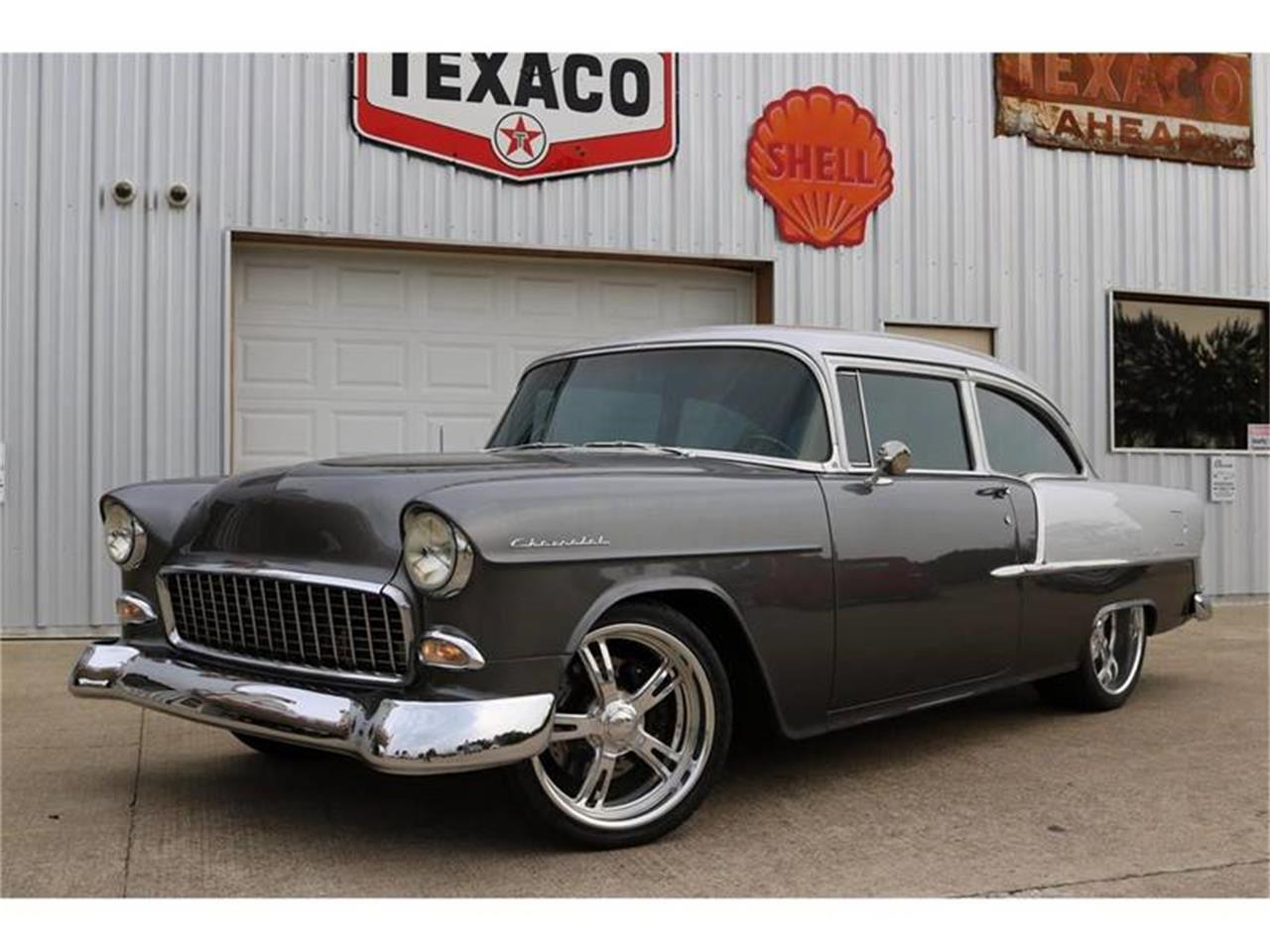 The striking two-tone silver and gray paint paired with the lowered stance truly set this classic Chevy 210 apart from all others. The stroker motor backed by the 700R4 transmission. 383 Stroker (425ci), Auto (w/pistol grip shifter), RideTech Air Ride w/4 link rear end, Shaved Firewall, Programmable MSD Ignition, Serpentine Front Runner Kit, Edelbrock Intake, Moser Axles and Internals, Power Steering, Slotted/Cross-drilled 4-wheel Disc Brakes, 26 Gallon Stainless Tank, Custom Interior, Gray Leather Bucket Seats, Tilt Steering, Tinted Glass, Sony AM/FM/USB/Satellite Stereo, Diamond Audio Amps, Custom LED Lighting, Custom Interior w/ Upgraded Gauges, A/C, Center Console Storage, Chrome Grill, Chrome Bumpers & Mirrors, Cloth Floormats, Schott Mod5 Alloy Wheels, and New Nitto NT Extreme ZR-rated Tires.