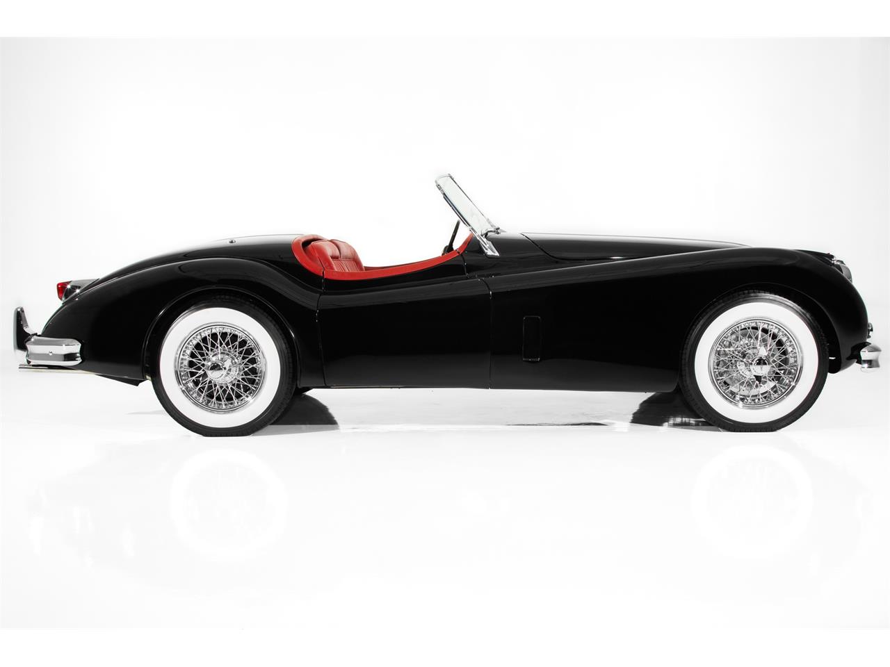 Exquisite black 1956 Jaguar XK 140 convertible with gorgeous red leather interior. This incredible black Jaguar has stunning body lines and panel fitment which is accented by very nice chrome all the way around and that iconic grill.The interior is impeccable with beautiful red hides
