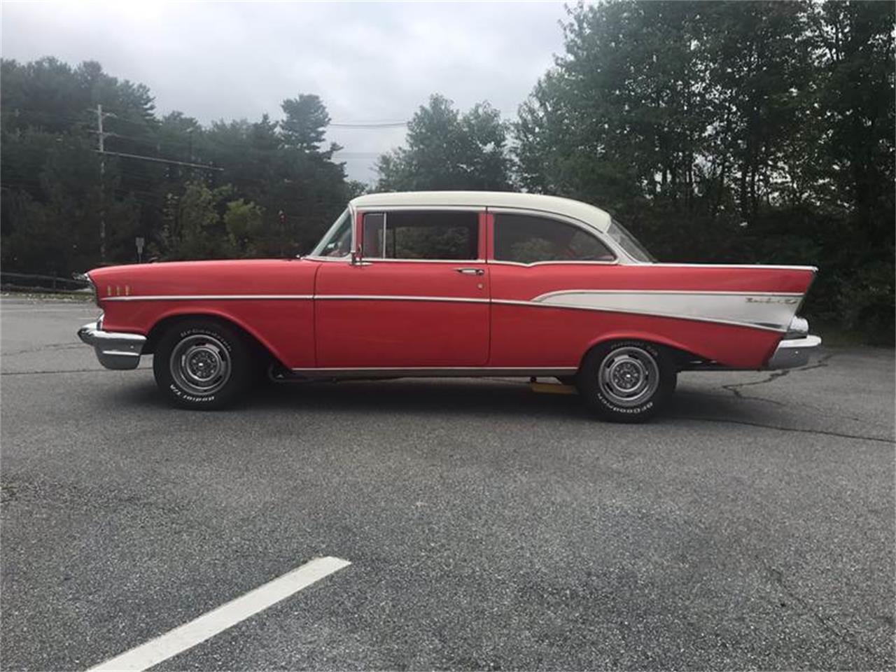 This 57 has undergone a frame-off restoration. The underside looks beautiful, as you can see in the pictures. Its got nice red paint, with a white roof. The interior is all new, and in perfect condition. This car has a nice 327, with a 4-speed transmission.