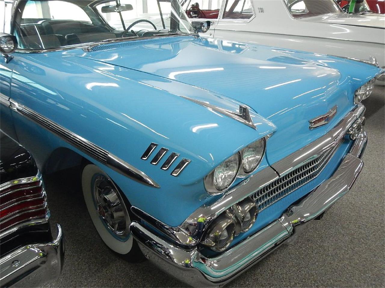 This 58 Impala is one of the showroom cars for many reasons. A smooth driving classic that has been refreshed all throughout, painted a beautiful light blue with fender skirts, continental kit and spotlight mirrors along with all the chrome polished and looking like new. Powered by the known dependable 283 V8 engine with a newly done exhaust, paired to a 3 speed column shift manual transmission.