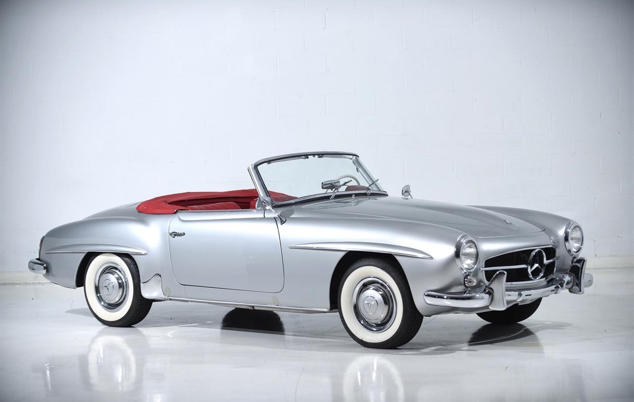 1957 Mercedes 190SL Roadster featured in silver, with a rare matching silver removable factory hard top, black convertible top, and red leather interior. The car has been subject to a complete nut amp, bolt restoration and is in excellent condition. It is all matching numbers. Having been used gently since the restoration, it is well sorted and ready for touring.
