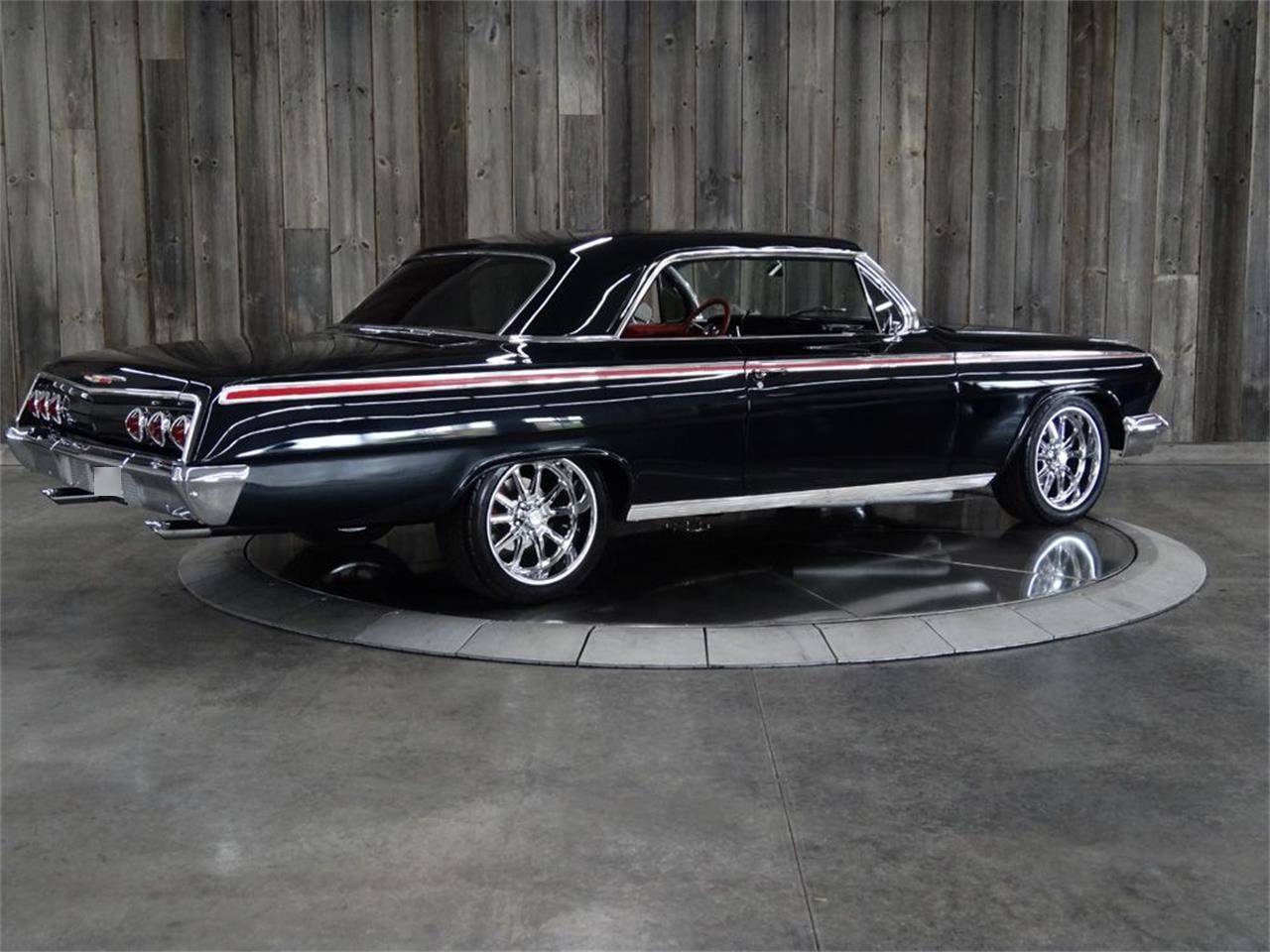 1962 Impala 2 door Custom. Finished in dark midnight blue paint. Complete Frame off rotisserie restoration, new custom red interior with impala logo accents. All New Interior, seats, carpet, door panels, dash, gauges, lenses, carpet Full width Floor Mats etc.