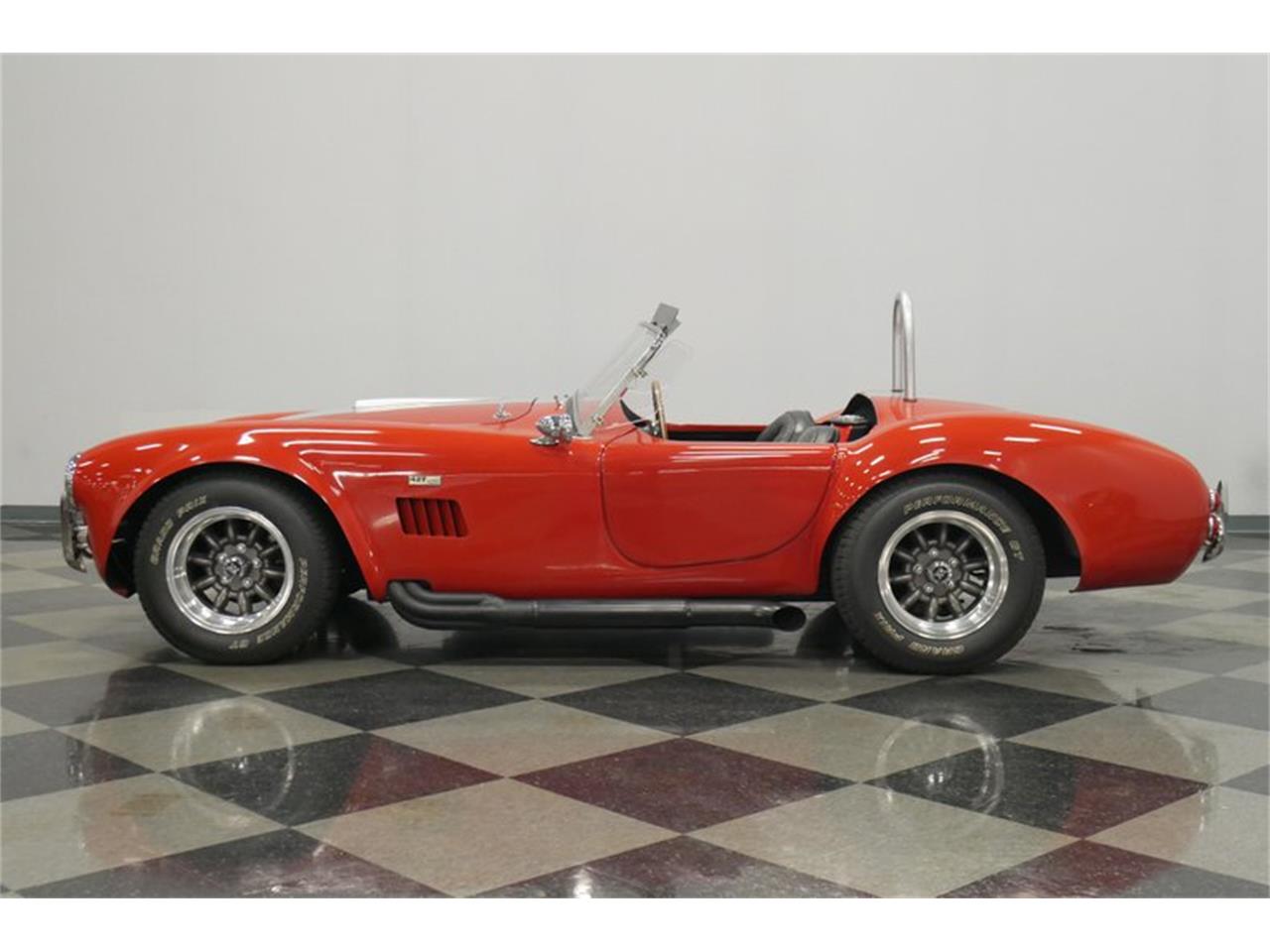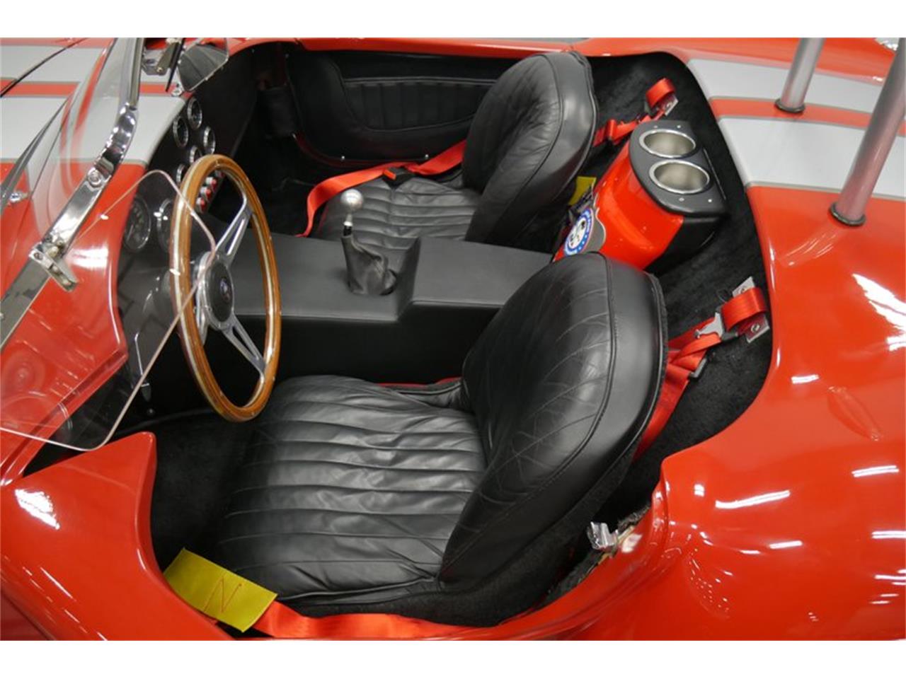 1965 Shelby Cobra, 351 Cleveland V8 that belts out plenty of horsepower and torque. In a lightweight Cobra, performance is impressive and the sound pumping out of those side pipes is even better. Dressed in full Cobra regalia with finned Ford Racing valve covers and an oval Cobra air cleaner, the engine bay is purposeful and functional, with good service access. It looks quite fresh overall and there's plenty of evidence of having been driven, but also lovingly maintained. The engine springs to life easily thanks to a 4-barrel carburetor on a performance intake manifold, a Mallory ignition, and block-hugging headers that feed the thumping side-pipe exhaust. A Mustang II style front suspension with purpose-built A-arms and rack-and-pinion steering make it corner like it's on rails, while a robust Jaguar independent rear hangs out back. There are also substantial 4-wheel discs brakes installed on this Cobra, which is exactly the stopping power you want in a lightweight car with all this horsepower. 10-spoke Western wheels are a modern look that seems appropriate for this Cobra and the tires are right-sized at 235/60/15 white-letter radials at all four corners. Bright red Ralli Art seatbelt harnesses are a welcomed safety addition, and that steering wheel is a handsome three-spoke piece with a warm wood rim that looks right at home in the Cobra's cockpit. Vintage-style, black-faced Stewart Warner gauges have been fitted in the center of the dash with a tach and speedometer just ahead of the driver and just below them is a set of auxiliary switches for some of the accessories. No radio, no tacked-on A/C, no modern gauges, just a simple, clean interior that was what a Cobra buyer would have received in 1965. Even the trunk is finished in matching carpets and provides just enough room to carry all your car show goodies.