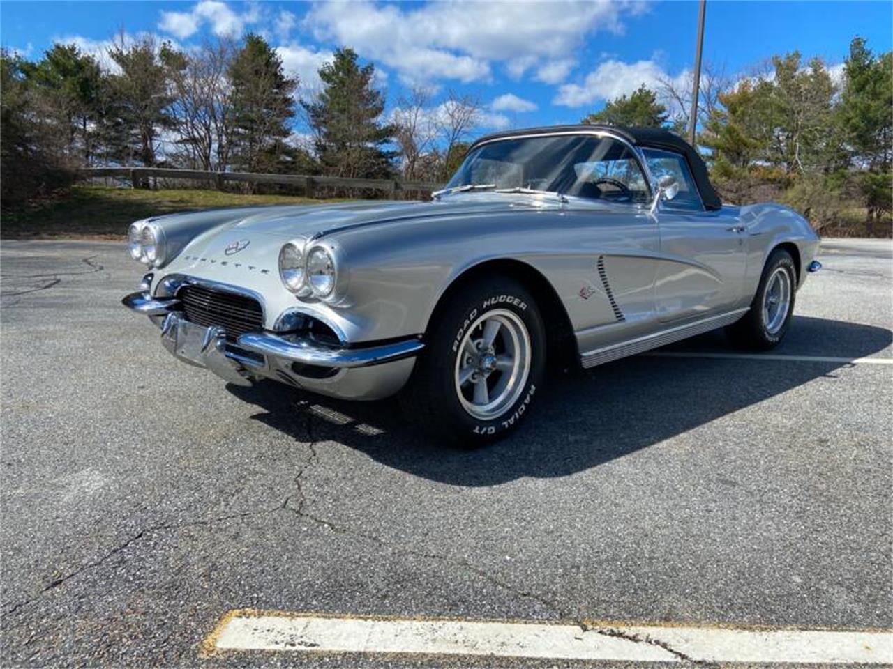 1962 Chevy Corvette. Beautiful color combination of platinum silver on black interior, and black convertible top.
