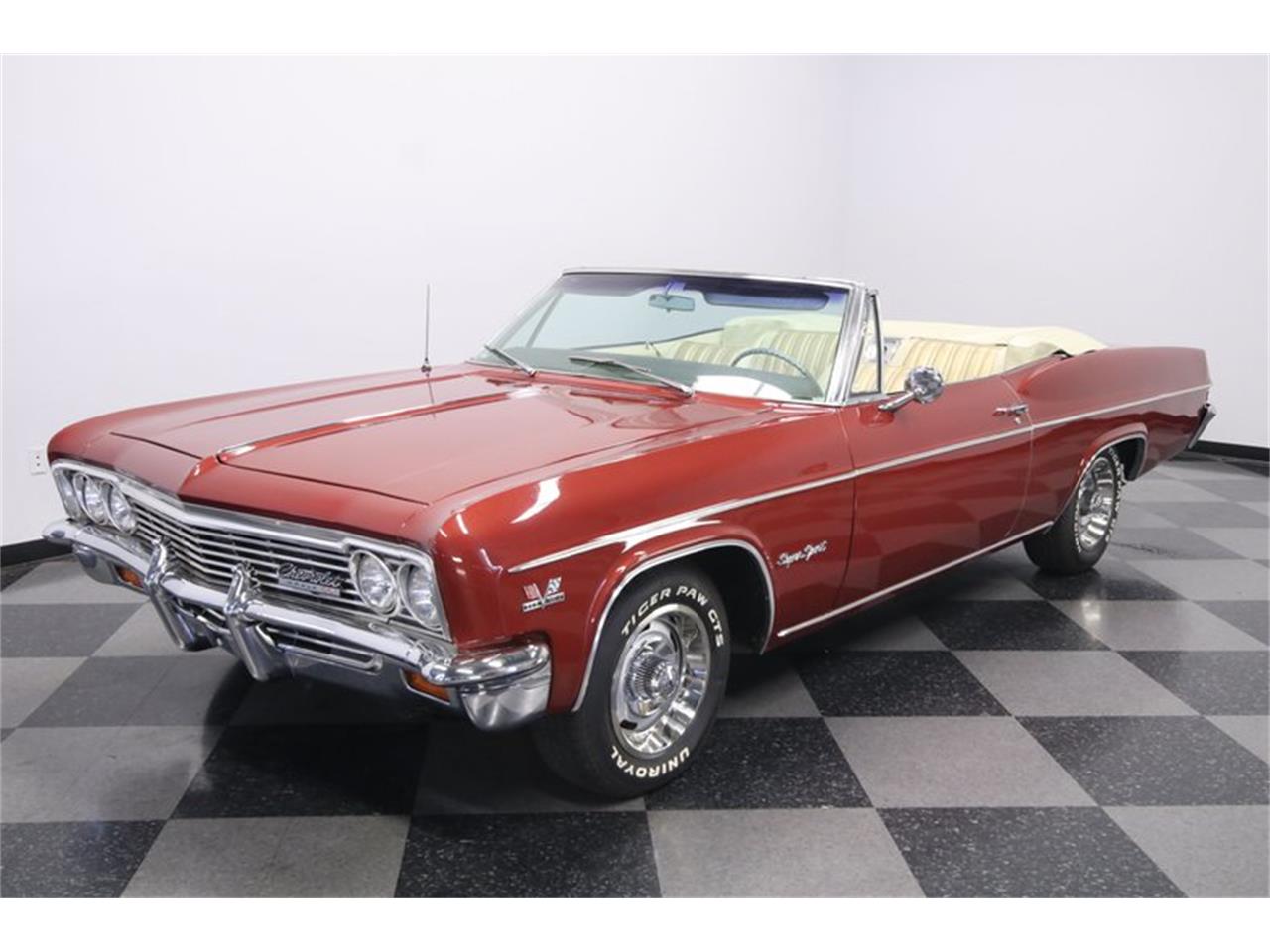 1966 Chevrolet Impala SS 396 convertible. Numbers-matching big block. It has a terrifically stock look with the bright block radiating within the dark engine bay. And even the decals look correct everywhere. Holley four-barrel carburetor. It makes for a strong setup as the V8 fires up easily, inhales deeply, and makes a sweet exhaust tune. The TH400 three-speed transmission is a nice pairing for a stout setup and automatic shifting. This easy cruising package is completed with power steering and power brakes. This is really a terrific vintage total package that even keeps the AM radio on display and gives you provisions for factory air conditioning.
