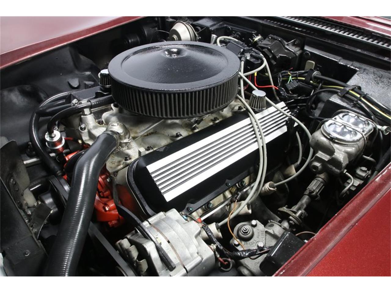 1968 Chevrolet Corvette Convertible. 454 cubic-inch V8. Plus, it's got all the right performance pieces, like aluminum heads, a rebuilt four-barrel carburetor, aluminum intake, and headers that add power before feeding those wicked side pipes. You'll even spot nice supporting components, like the electronic distributor and aluminum radiator. The TH400 three-speed automatic transmission is a stout unit that know how to handle this big power motor. This convertible comes with a desirable two-roof package. And both the folding soft top and removable hard top are finished in a black that looks quite nice against the exterior burgundy. Bucket seats and a grippy three-spoke sports steering wheel are all that you need to know that this one is ready for power driving. As a first-year C3 it has some of the most brightwork of the bunch, including the shark-like front bumper, curvy two-piece rear bumper, windshield trim, rockers, and Rally wheels. Plus, this one has been upgraded with added shine around the body grates and vents on the big block hood.