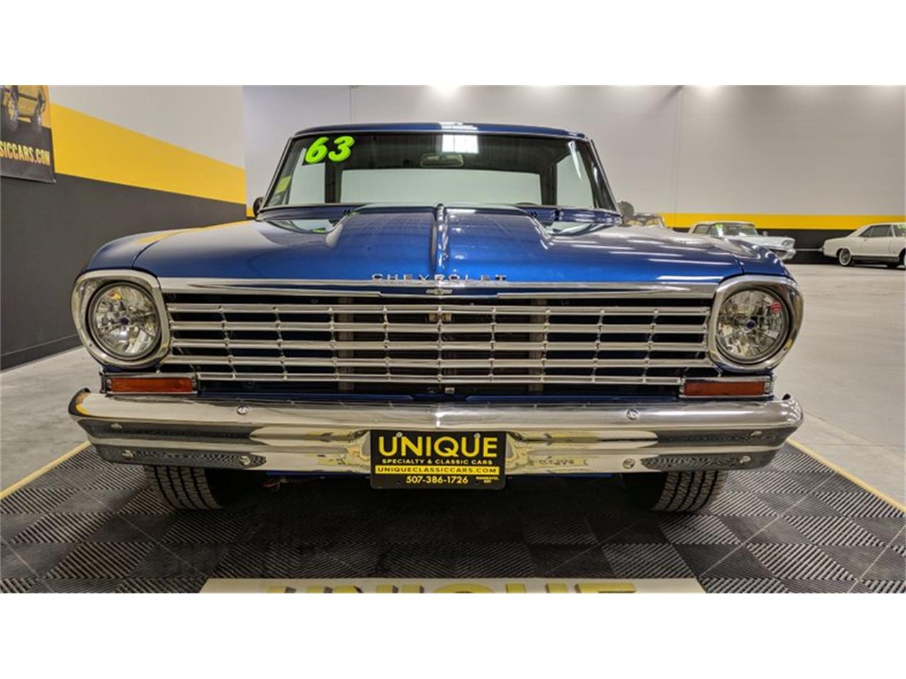 1963 Chevrolet Nova SS finished in blue paint with flames on both sides.