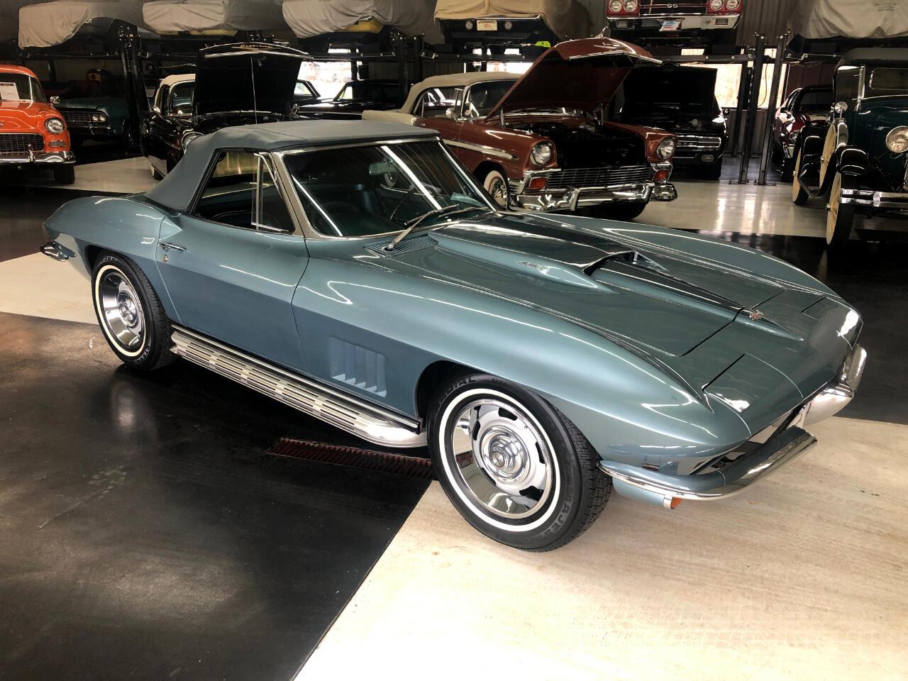 1967 Corvette Elkhart Blue with teal interior and the ORIGINAL teal top and teal stinger. It's powered by a 427/390 H.P. with a Borg Warner 4spd with a Competition Plus Hurst shifter. 43K actual miles. Mostly original paint and all original interior that is near perfect. The underside is completely unrestored and solid. All chrome and brightwork is 100% original and very nice. No hit body and drives like a 43000 mile car.