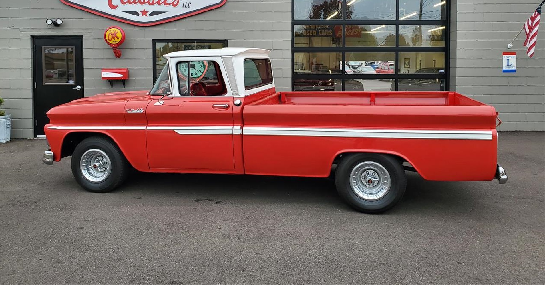 1962 C-10 custom cab, long bed pickup. Powered by a 350 Chevy power plant and bolted to a turbo 350 transmission, going back to a 12 bolt rear end. Power steering, power brakes, full "Dolphin" gauge cluster, AM/FM stereo, 1961 Chevrolet Impala two tone steering wheel on a tilt steering column. Custom two-tone red/white seat cover, all in the original big back window cab. All rechromed OEM bummpers and trim. 8.5 inch rally wheels with unique trim and new radial tires.