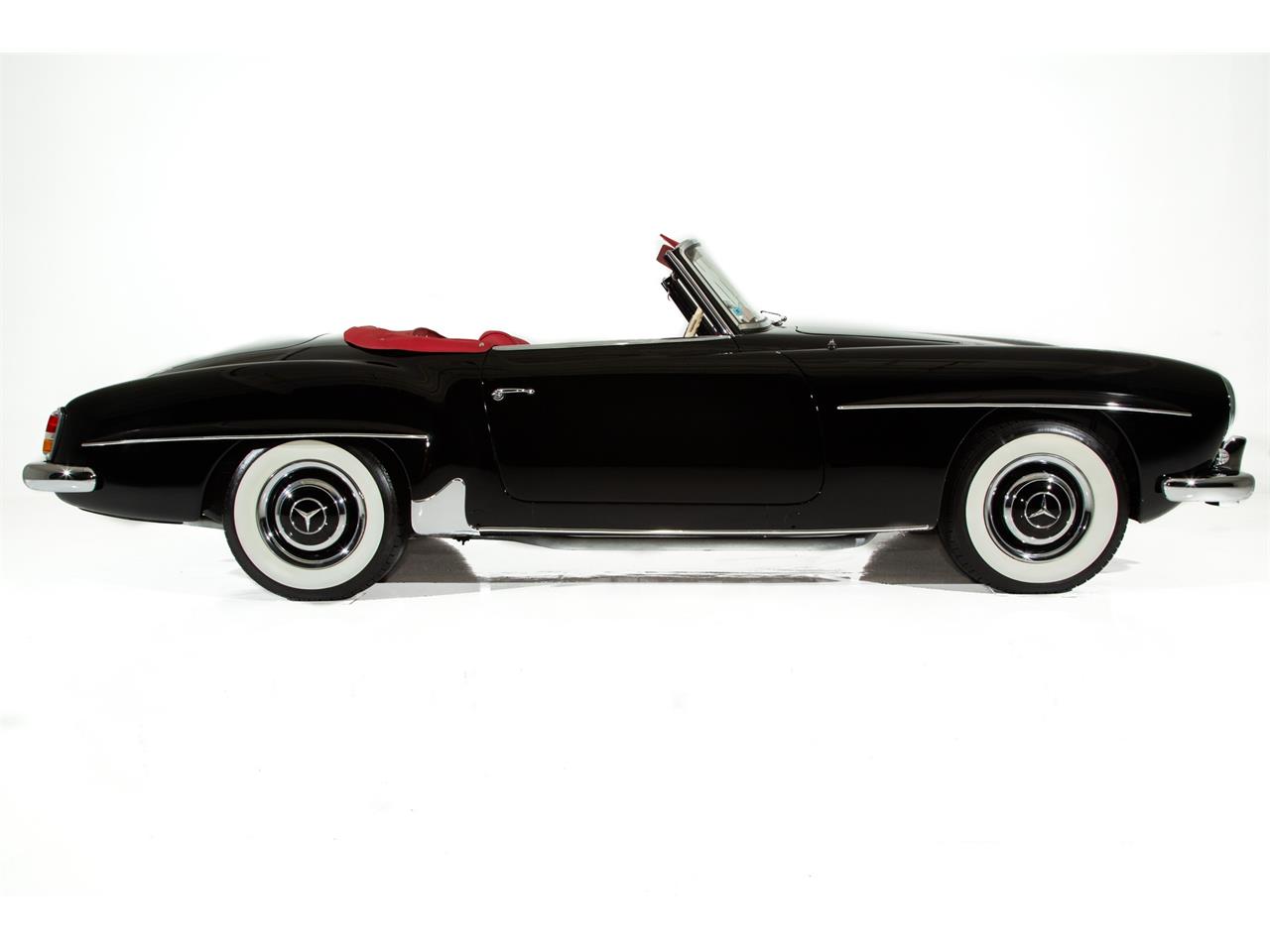 Stunning factory black Mercedes-Benz 190SL convertible with lush red leather interior. Low mileage 30,000. Laser straight body with perfect lines and show chrome are what you would expect for a high quality, investment grade Mercedes-Benz. The amazing original floors are still covered in the factory color as well as factory torque markings on the suspension all lends to substantiate a low mile car. This car has its original engine tag and matching stamped motor number, front chassis plate with matching chassis stamp and firewall tag. Original drive train, 1.9 Liter 1897cc engine Show quality detail on the engine compartment 4 -Speed manual transmission Original tool kit Original tire pressure gauge in original wooden box Original electrical fuses in original box.