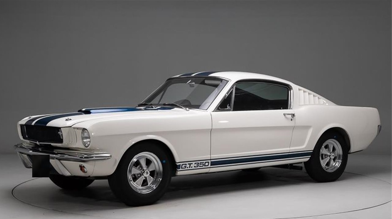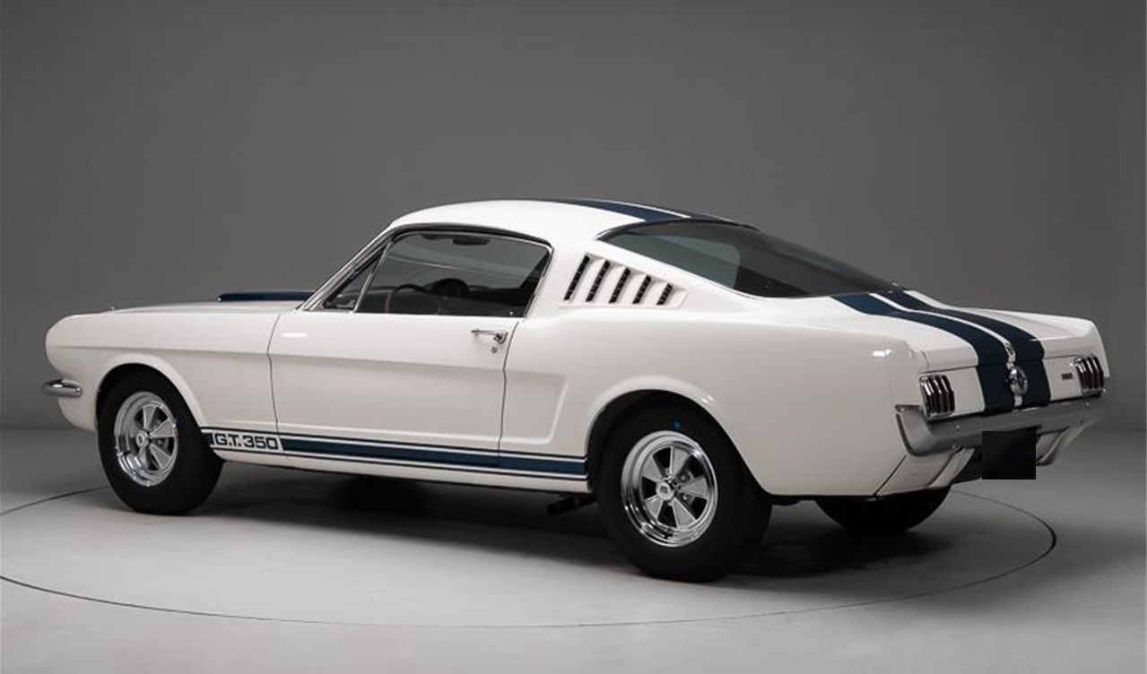 1965 Shelby Mustang GT350 For Sale. The 1965 Ford Mustang Shelby GT350 was offered in a single exterior paint option. Wimbledon White with optional blue LeMans stripes in Guardsman Blue that ran down the center of the body and with a functional hood scoop, the fiberglass hood of the car made it something of an icon on the road.