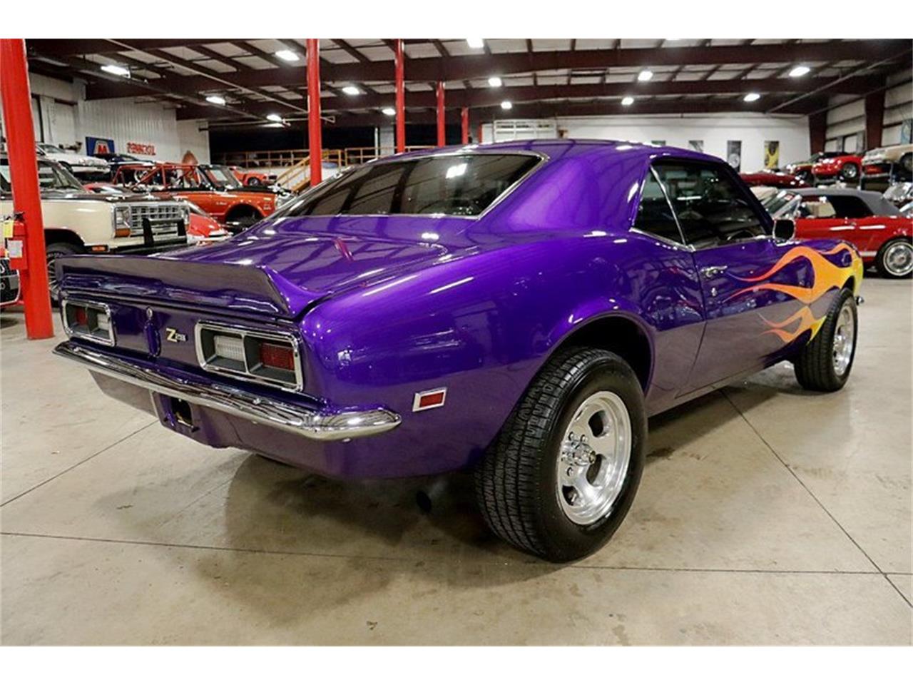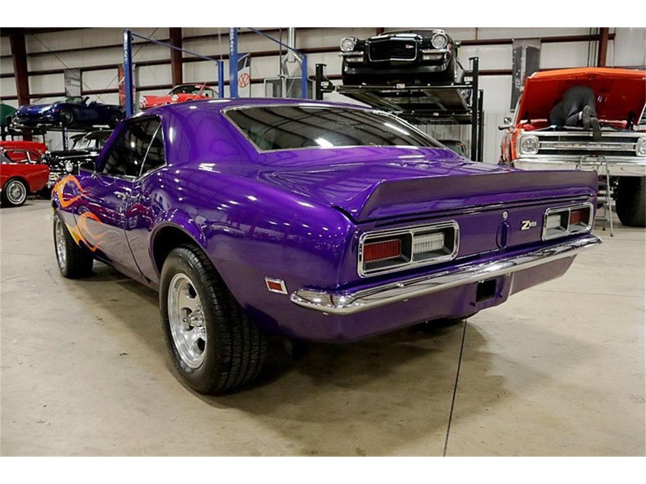 1968 Chevrolet Camaro for sale. It is finished in a Ford basecoat/clearcoat Ultra Violet Pearl. It is powered by a Taylor-Made Mouse 355 v8, 5 speed Tremec manual transmission. Highlights include P245/60R15 tires in the rear and P215/60R15 in the front on Ansen Sprint wheels with BF Goodrich tires. Other highlights includeAM/FM/Cassette, center console, cowl hood, aluminum radiator, electric cooling fan, aluminum heads, aluminum intake, power brakes and power steering, 4 piston calipers, 10 bolt rear end with rebuilt Eaton 3:83 posi rear end Holley carburetor and intake, Hedman Elite headers with Flowmaster American thunder exhaust.