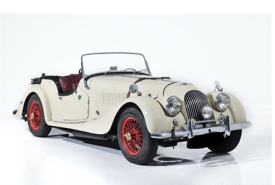 1961 Morgan Plus 4 Four Seater Tourer featured in Ivory with dark red leather interior. Look closely at the loving patina on this Morgan and consider its most fascinating story.