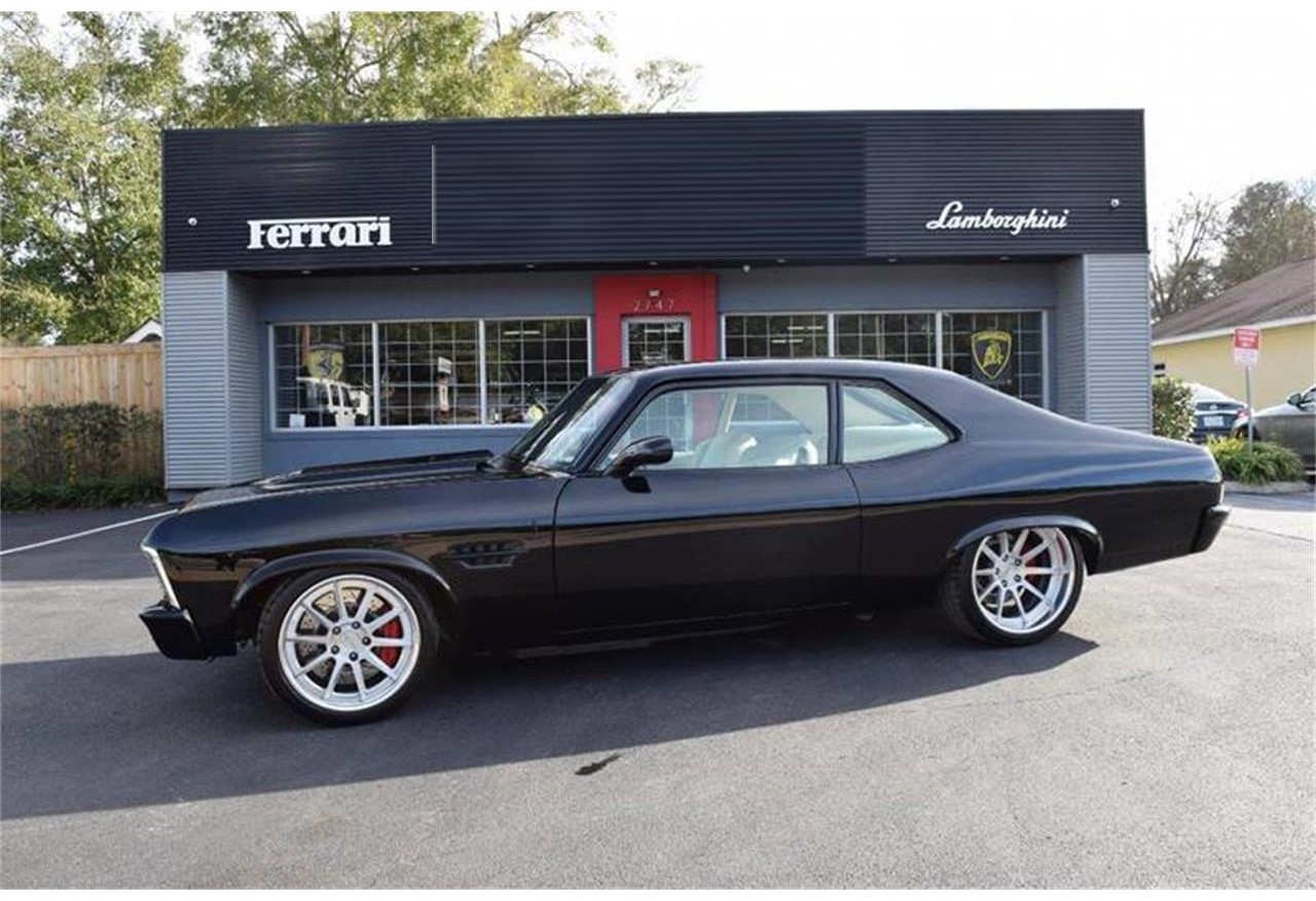 1968 Chevrolet Nova. It is powered by a supercharged Lingenfelter LSA engine mated to a Tremec T56 6 Speed manual transmission. Be cool radiator, Baer 4 wheel disc brakes and a Hydro boost master cylinder hidden underneath the glove box. It is finished in eight coats of black base coat clear coat paint with sequential LED taillights.