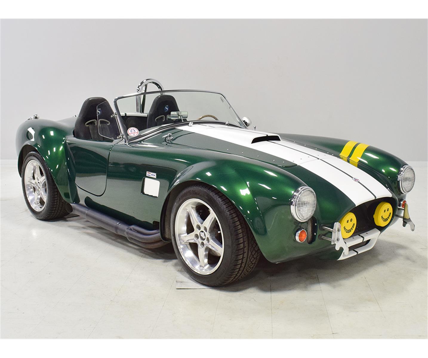 Mostly stock Cobra 5.0, Tremec 5 speed, 4 wheel Wilwood disc brakes, competition seats and harnesses. Fantastic paint, drives extremely well. Sorted, beautiful, and fast. This gorgeous Factory 5 Cobra was built a few years ago but you can see that they guys doing the fiberglass work really did a nice job, because it is smooth, the panels fit well, and there is just no evidence that it is glass until you rap your knuckles on it. The metallic green paint with white stripes is a traditional Cobra look and we like the somewhat subtle color combination.