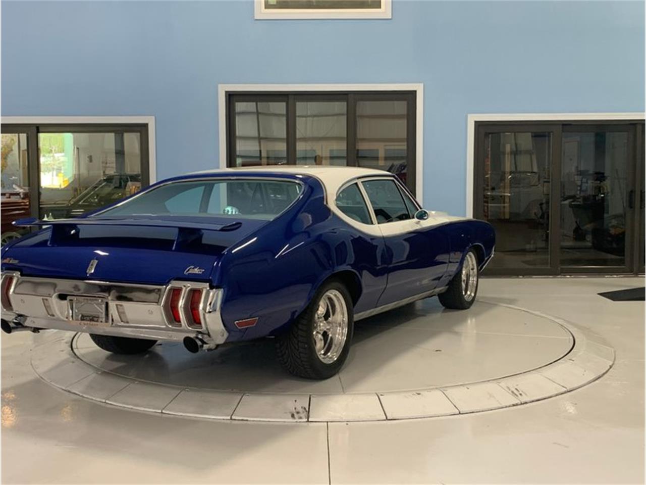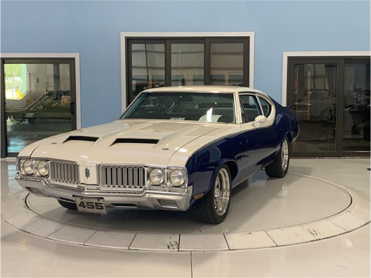 1970 Oldsmobile Cutlass S, 455 cubic inches with a whole lot of go-fast internals, Edelbrock carburetor and intake, MSD Billet distributor and box, with exhaust flowing thru the Hooker thermal coated heads and into the dual exhaust system. Power is transfer back to a Hurst shifted 200R4 overdrive transmission for better highway fuel economy and a beefy 3.42 POSI unit to handle off the line starts. The engine compartment looks great as it is painted, polished, and detailed and the engine has chrome valve covers, open air cleaner, alternator, and a J and B Microfinish polished, ball-milled battery cover and an A/C compressor cover shroud out of aluminum sheet stock.