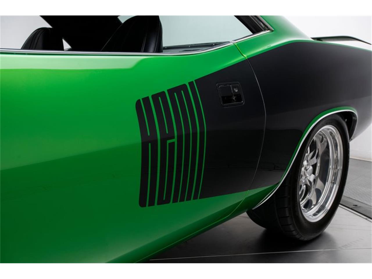 426 cubic inch Hemi V8 with Edelbrock dual-quad induction Tremec 5-speed manual transmission with a hydraulic clutch and a Hurst Pistol Grip shifter Dana 60 rear axle with a posi-traction differential and 4.10 gears Modern air conditioning Power steering Front disc and rear drum brakes Upgraded suspension with welded subframe connectors Black vinyl interior with power windows, Rallye Gauges and a tilting Tuff Wheel House Of Kolor Limetime paint with House Of Kolor Black Pearl billboards 17 and 18-inch Billet Specialties wheels Custom exhaust with Dynomax mufflers Modern Alpine audio