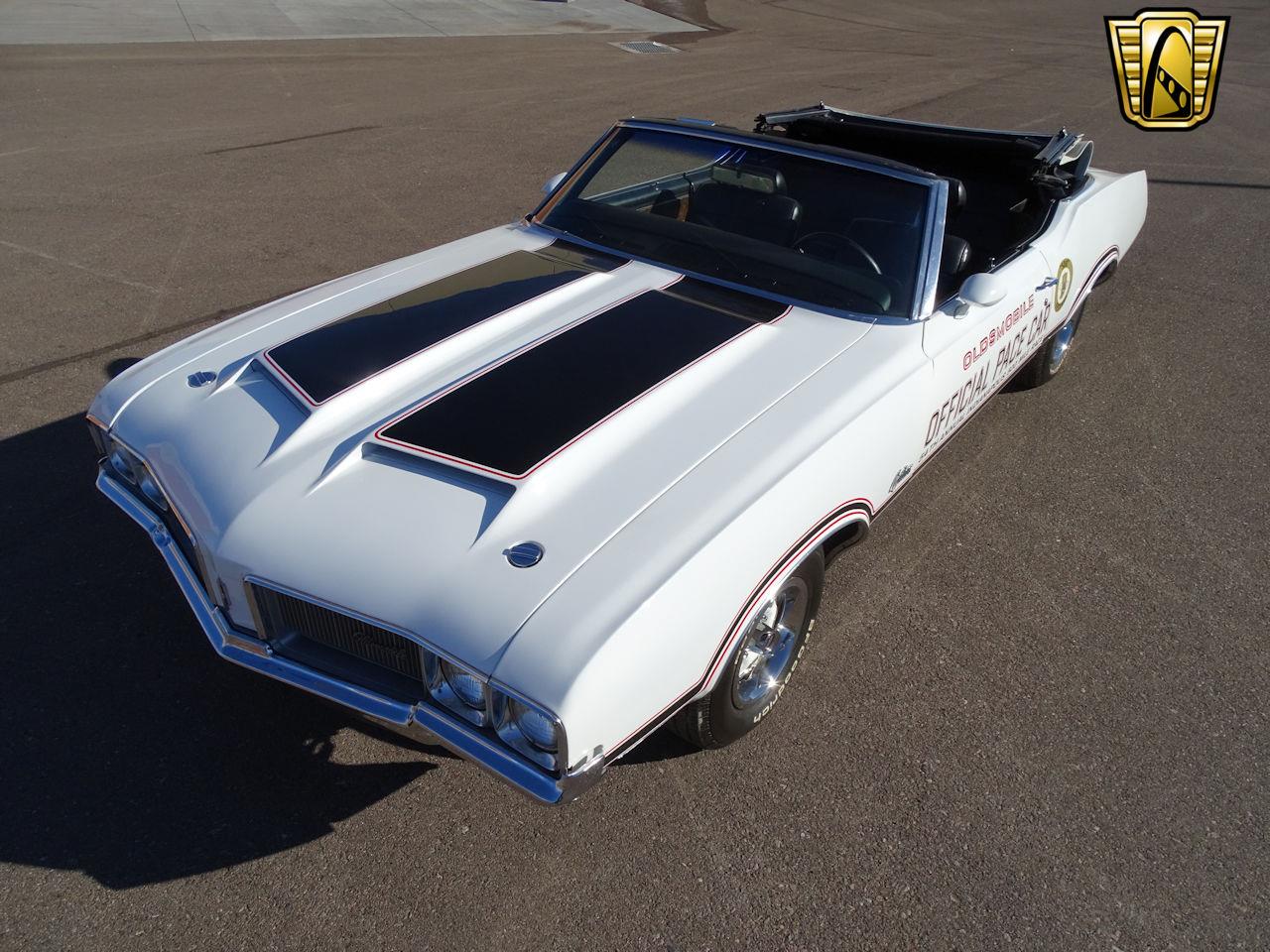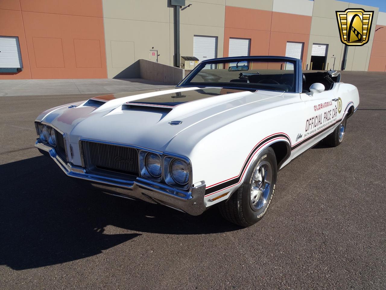 1970 Oldsmobile Cutlass Indy Pace Car convertible with A/C, AM radio, rally wheels, power brakes, power steering, and more. Original spare tire. This is a true pace car and is the number 11 car. White top contrasts nicely with the all-black interior. This Cutlass Pace Car includes Seat belts, AC, Power Steering, and radial tires. Number matching car.