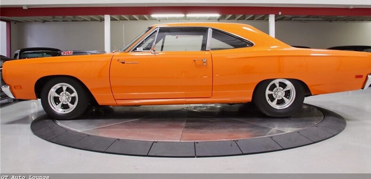 1969 Plymouth Road Runner in Vitamin C Orange over Black Interior. Equipped with a 440ci V8 Engine mated to a 4-Speed Manual Transmission. Steel crank. Ported heads. Edelbrock hi-rise TM7 intake manifold. Holley 750 double pumper carb. 8-3/4 Rear end with 3.55 gears. Lift-off fiberglass hood. American Racing 15"" wheels